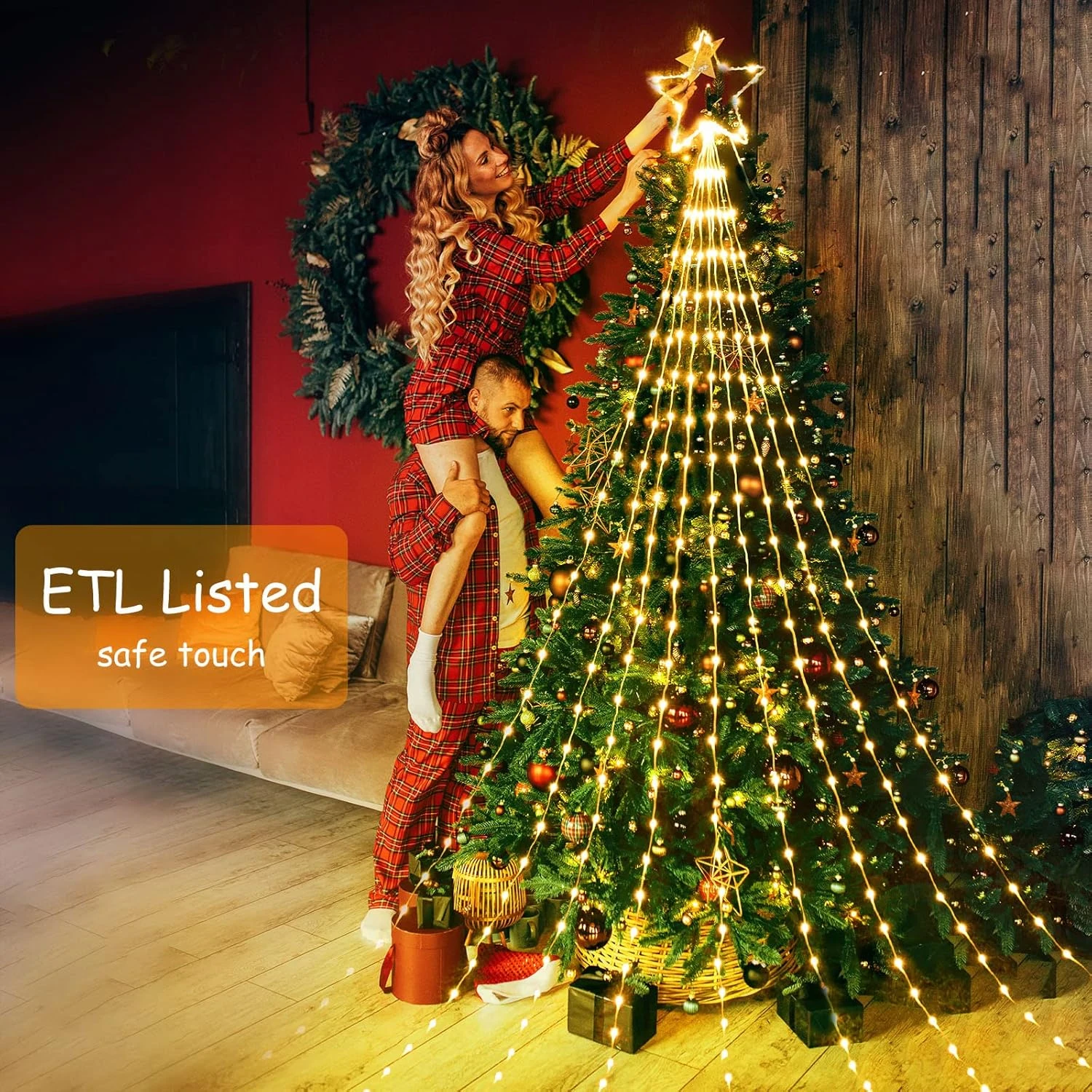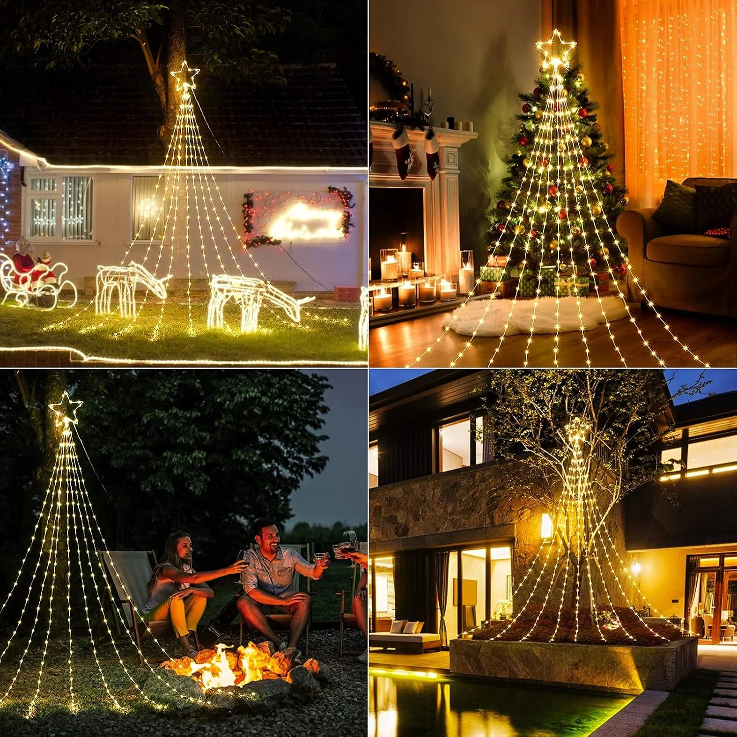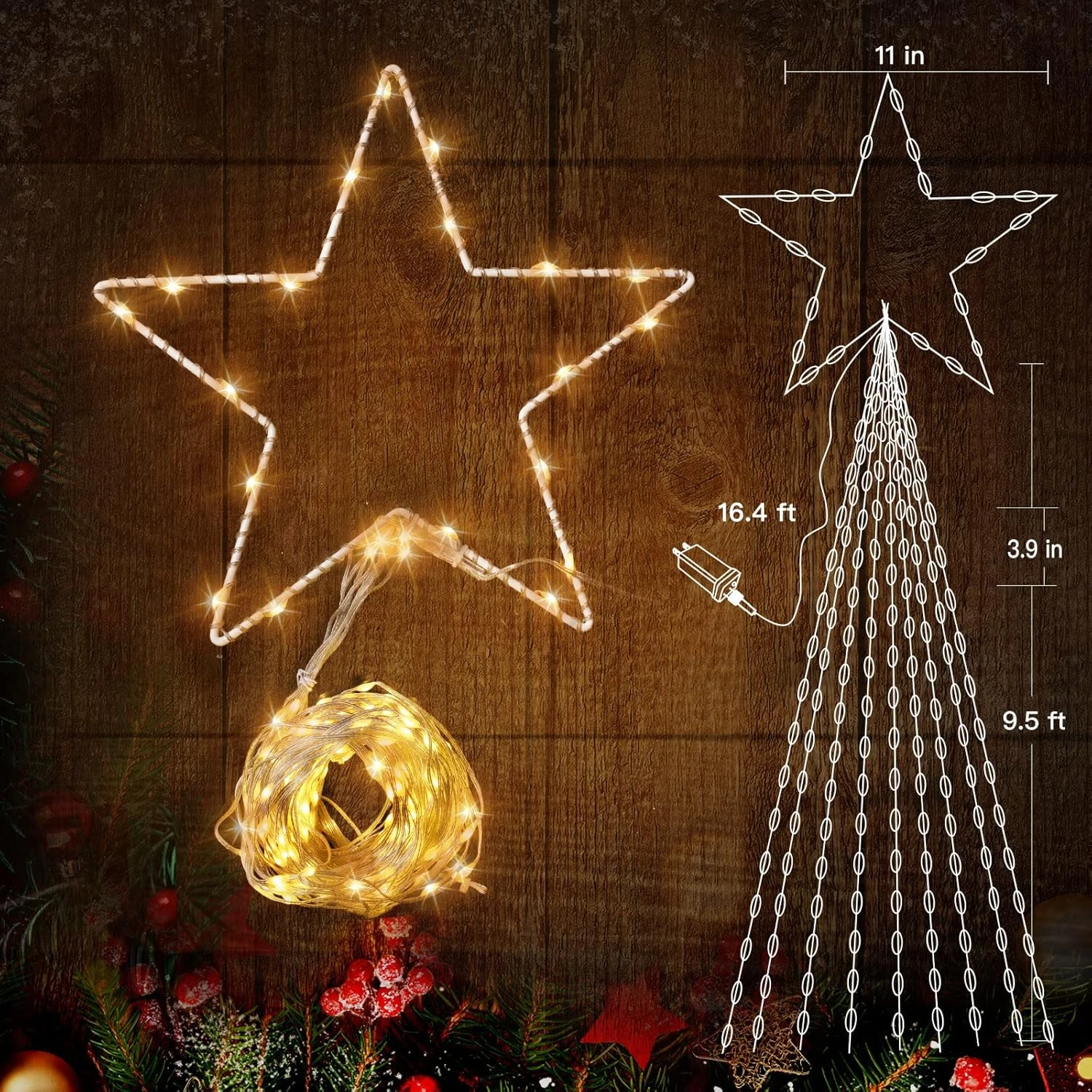 - Fantastic Decorating: 10Feet 290 LED 9 drops water flow fairy string lights with 11 inches star topper, bringing you into fairy world with starry warm white lights, creating a cozy and festival mood for your home, 1 hanging string and 9 ground spikes included, perfect for outdoor operation,16.4Feet lead length,allows you to decorate your home anywhere to the greatest extent