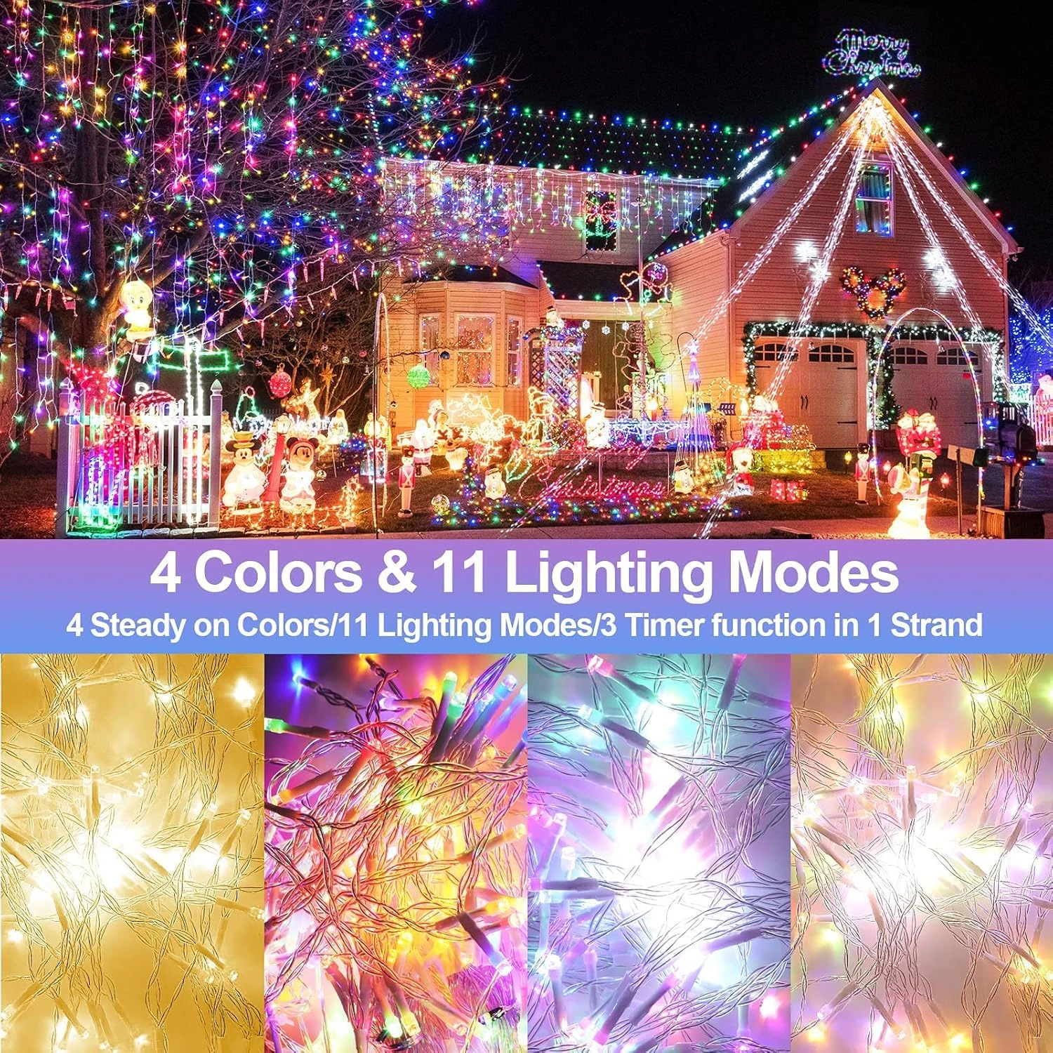 - 【11 Modes & Memory Timer Function 】 The outdoor Christmas lights have 11 different light modes: Comb, C1 Steady ON, C2 Steady ON, C1 Mixture, C2 Mixture, Slo-Glo, Breathing, C1 Slo Glo, C2 Slo Glo, Flash, In Wave. Dimmable & Timer Function: 100%-75%-50%-25% 4 level brightness. Open the timer function, string lights will 6 hours on and 18 hours off.