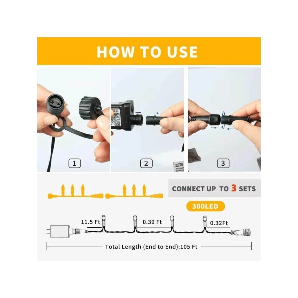 - Expandable – Each fairy light comes with an end-to-end plug, which makes you can connect max 3 sets together. Each one length is 105 feet with 300 LEDS, the max expandable length is 315feet with 900 LEDS.