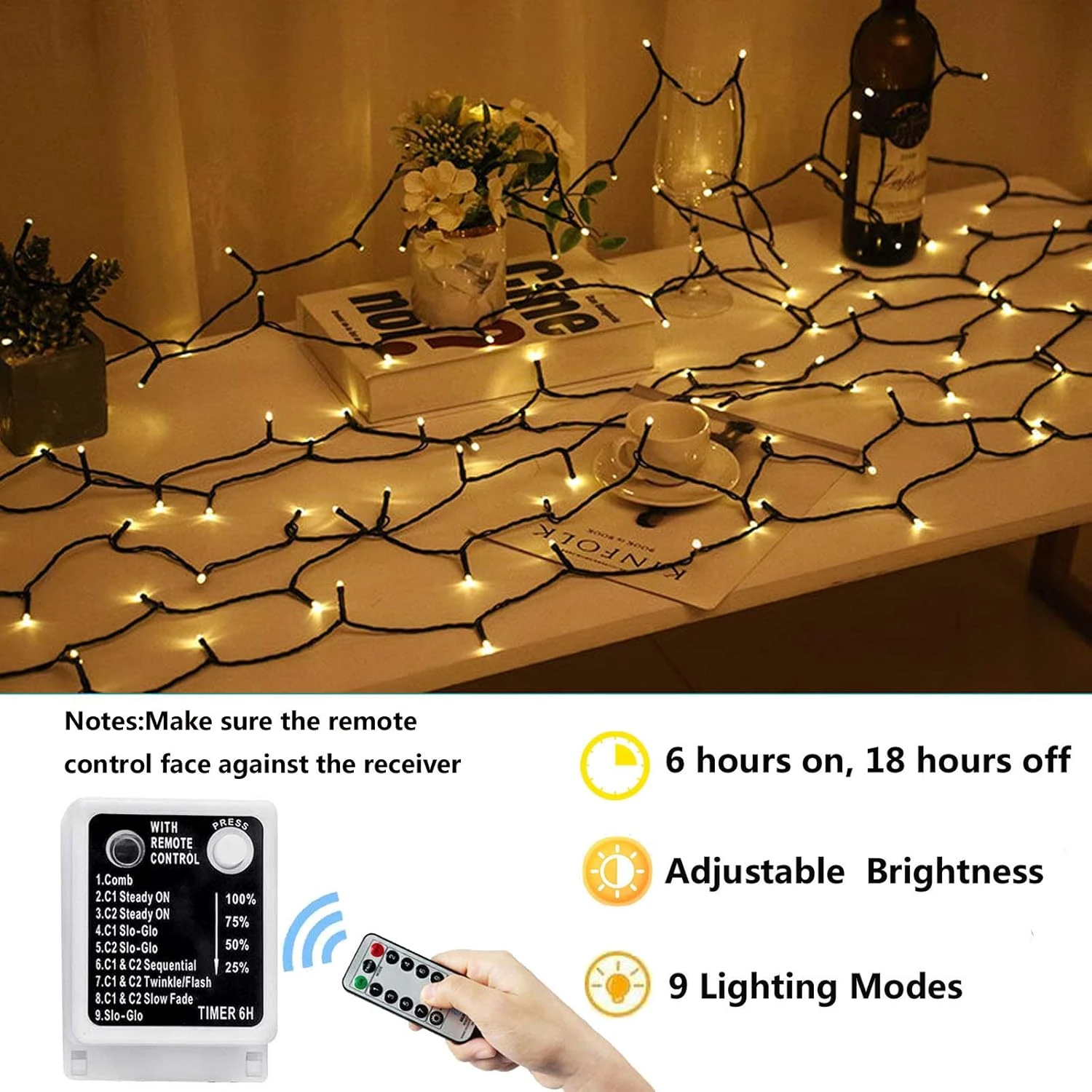 - Wireless Remote & Dimmer:Wireless Remote Control 9 Modes lighting (Warm & Color Combination/Warm Steady ON/Color Steady On/Warm Slo Glo/Color Slo Glo/Warm & Color Sequential/Warm & Color Twinkle/Flash / Warm & Color Slow Fade/ Warm & Color Slo Glo )and Auto timer(6 hours on, 18 hours off).