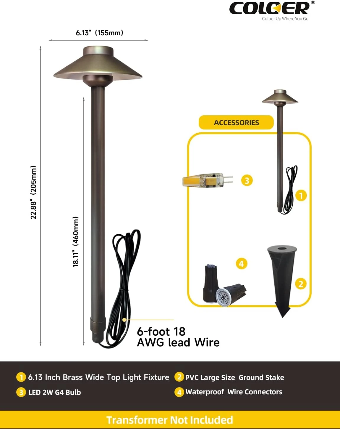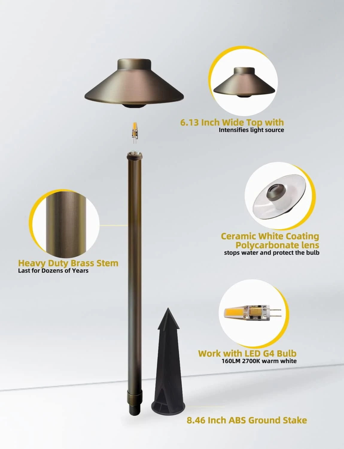 - SOLID HEAVY-DUTY STRUCTURE: Cast brass path light with frosted polycarbonate lens and 6-foot 18AWG, SPT-1 lead wire. Measures 22.88 inches tall with 6.13 inches diameter hat. The solid brass housing ensures excellent corrosion resistance and heat dissipation, while the fine workmanship makes it tougher, harder, and aesthetically pleasing.