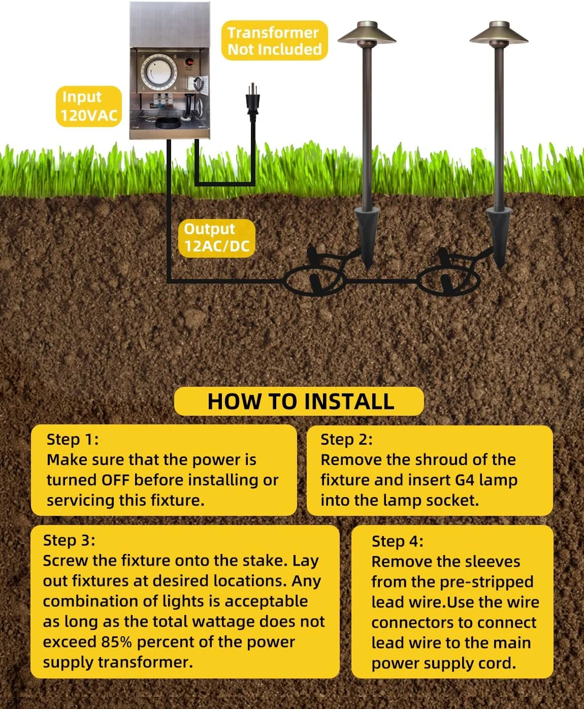 - EASY INSTALLATION: This sidewalk lights fixture with G4 bi-pin socket, compatible with G4 lamps up to 20W, you can easily install or replace the bulb. One energy efficient 2W G4 LED bulb,one 8.5″ high and 2.87″ diameter large PVC ground stake and two waterproof wire connectorsis included. Our professional-grade products are field-tested for durability and ease of installation. Even for those with no prior experience with low voltage outdoor pathway lights, installation is pretty simple.