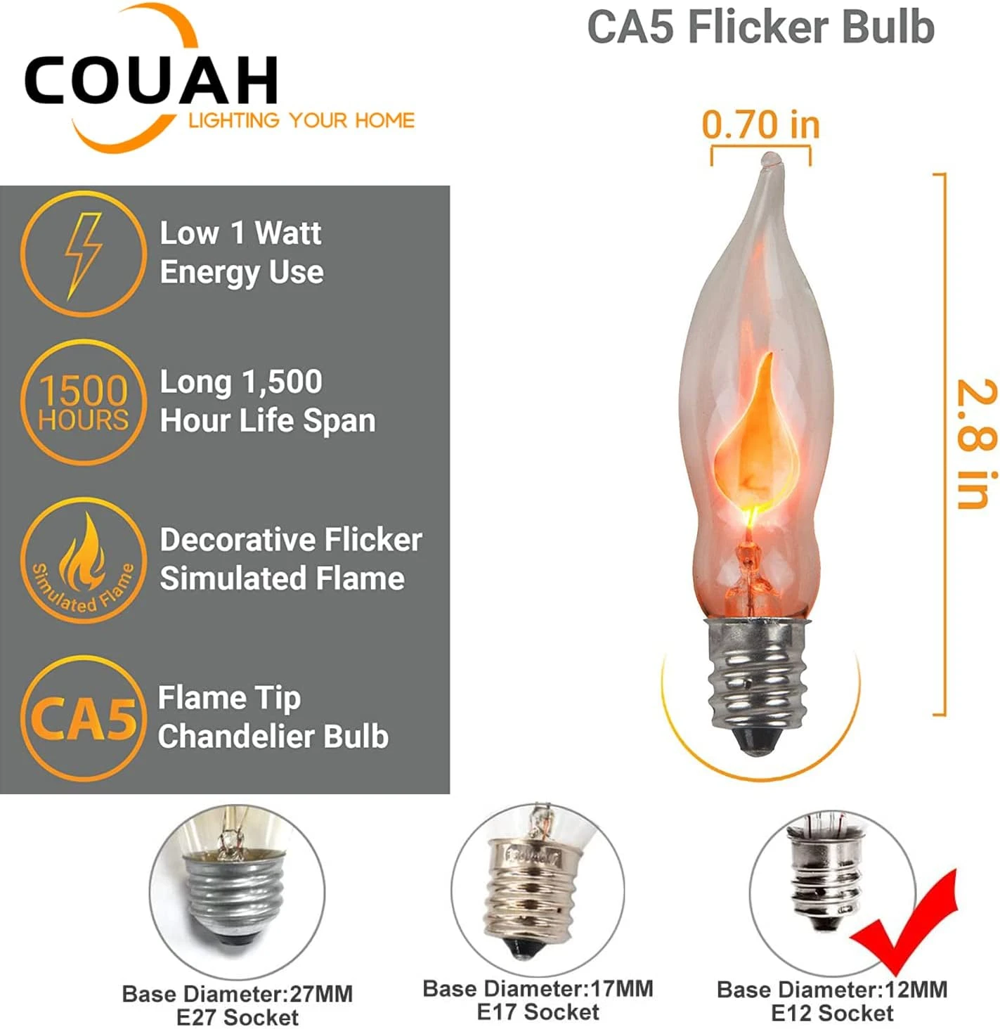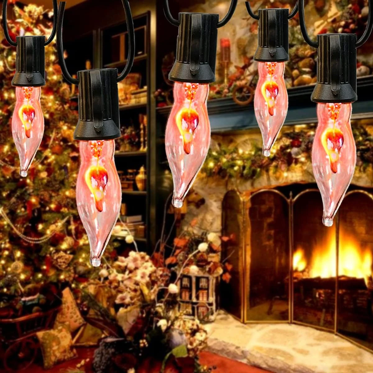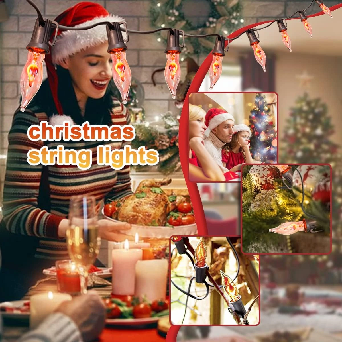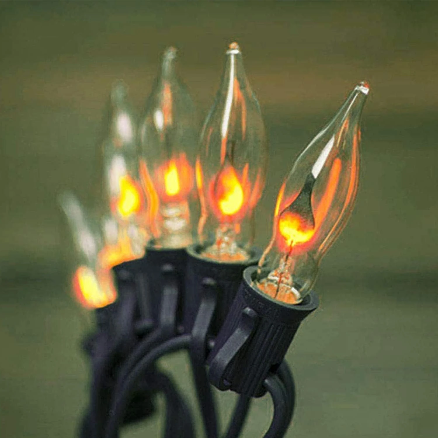 - 🔥10ft Christmas string lights, 10 clear flicker bulbs with have an orange, realistic flickering flame. 1 watt per bulb, each bulbs have a nickel base for extra protection from outdoor weather corrosion.