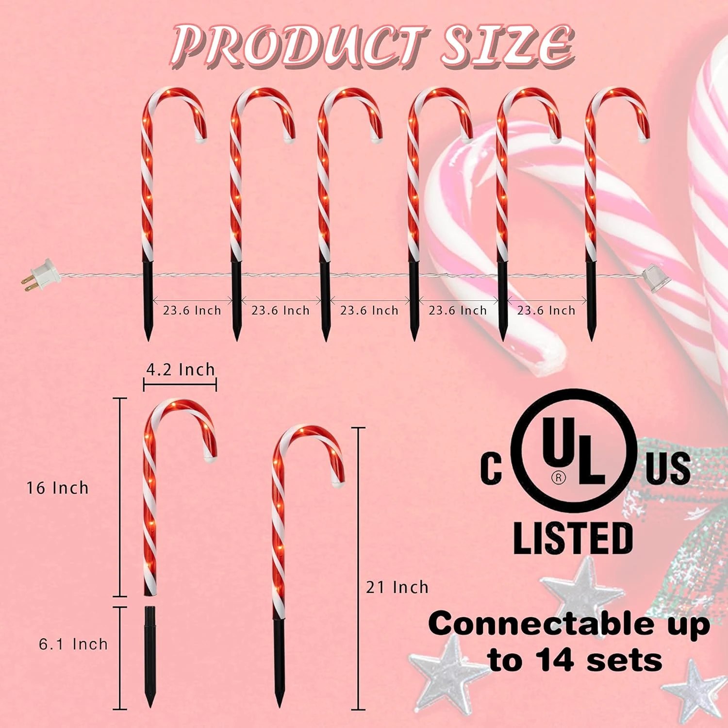 - Package Include: 12 pack candy cane lights (each set of 6 pcs). 12 pcs stakes. 4 Extra incandescent bulbs, 2 Extra fuse. (Each candy cane has 6 bright lights). The lead wire is 40 inch, tail wire is 4 inch, total length is 13.6 FT. Marker spacing is 23.6 inch.