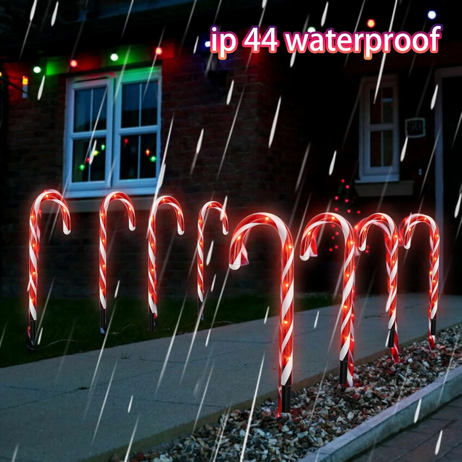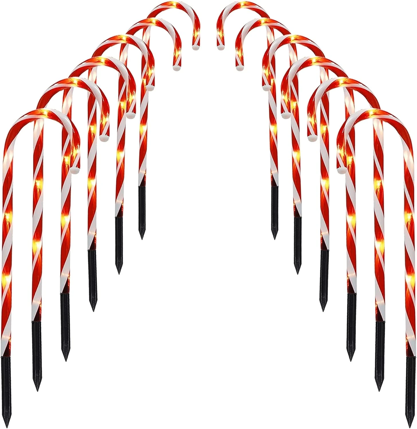 - Exquisite Christmas Pathway Lights: Dazzle Bright Candy Cane lights illuminate your way home and happily guide guests to your door. You can hanging it ong the window, tree, roof, patio, or place it on the ground with the stakes. Suitable for indoor outdoor walkway yard lawn Christmas tree decor. Creat a deep warm festival ambiance to your home.
