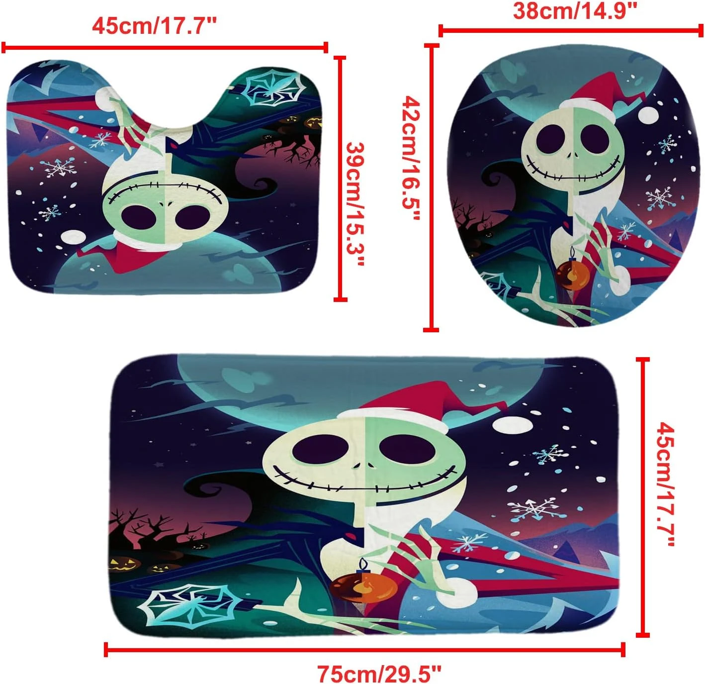 - [MULTIPLE ENVIRONMENTS]: This Jack skellington bathroom decor set can be easily installed in your home, apartment, hotel, dormitory, club and other places in need. This Jack skellington shower curtain and rug set can prevent water splashing outside the bath area and keep your bathroom and toilet clean. It’s a surprise gifts for friends and family.