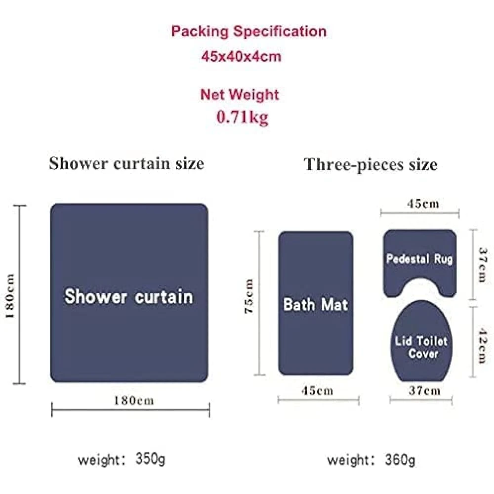 - 【Package including】1Pcs shower curtain + 1Pcs rectangle mat + 1Pcs u shape mat + 1PC toilet lid cover mat + 12Pcs hooks. The shower curtain measures 71 x 71inch, which can completely cover a normal bathtub. Suitable for most standard size bathtubs and showers.We use a vacuum-packed shower curtain set, the cushion will look thin when unpacked, and it can be wetted with water to restore the thickness immediately or leave it for 2-3 days to restore the normal thickness.