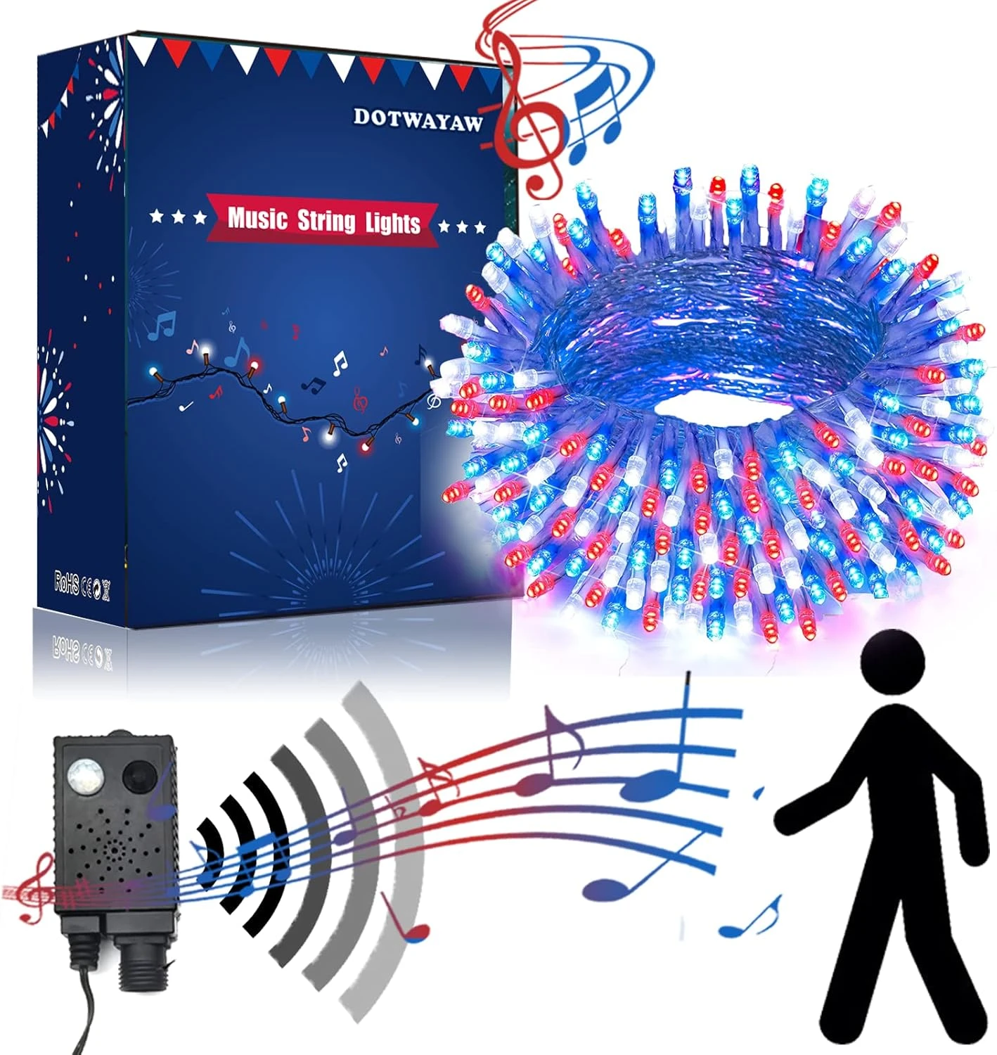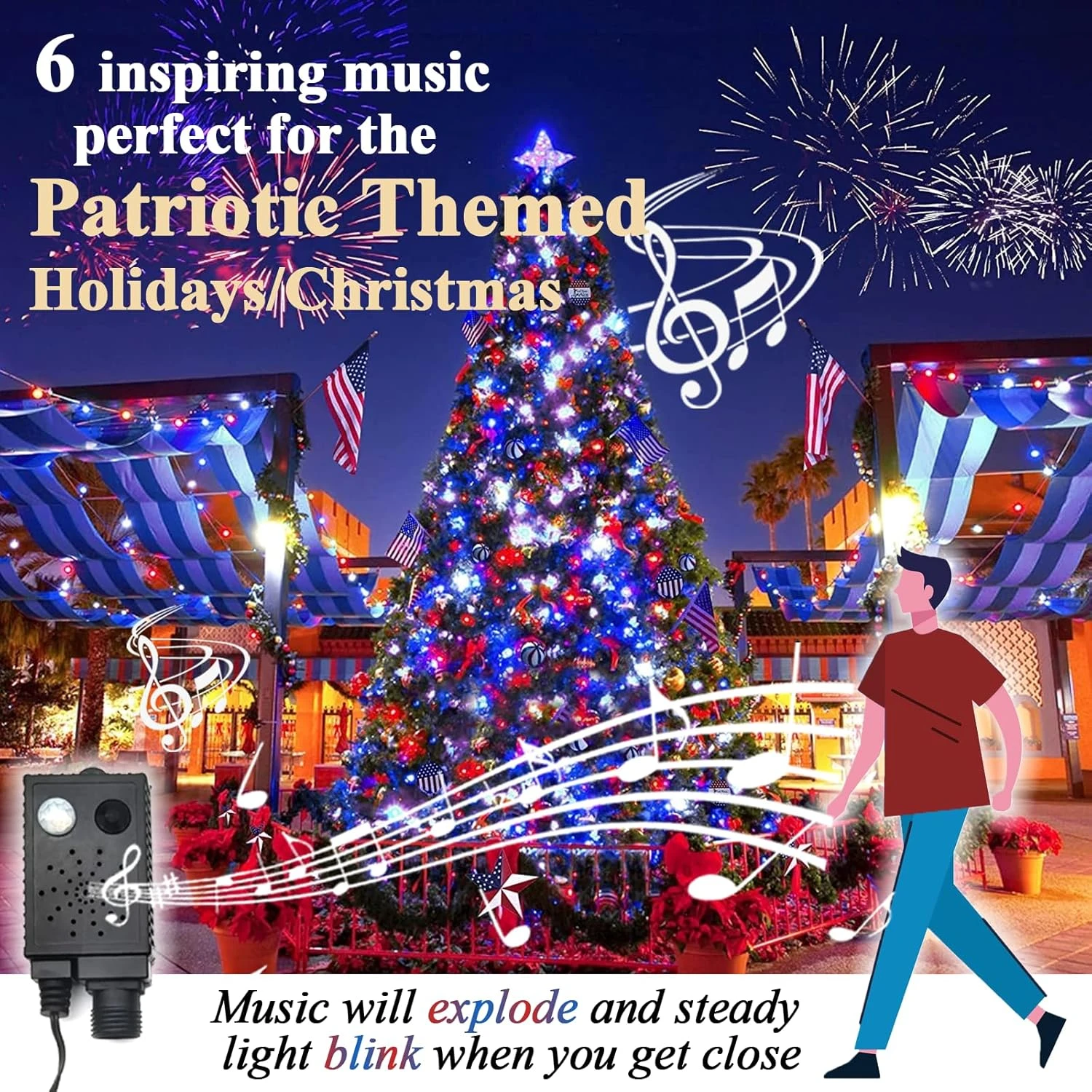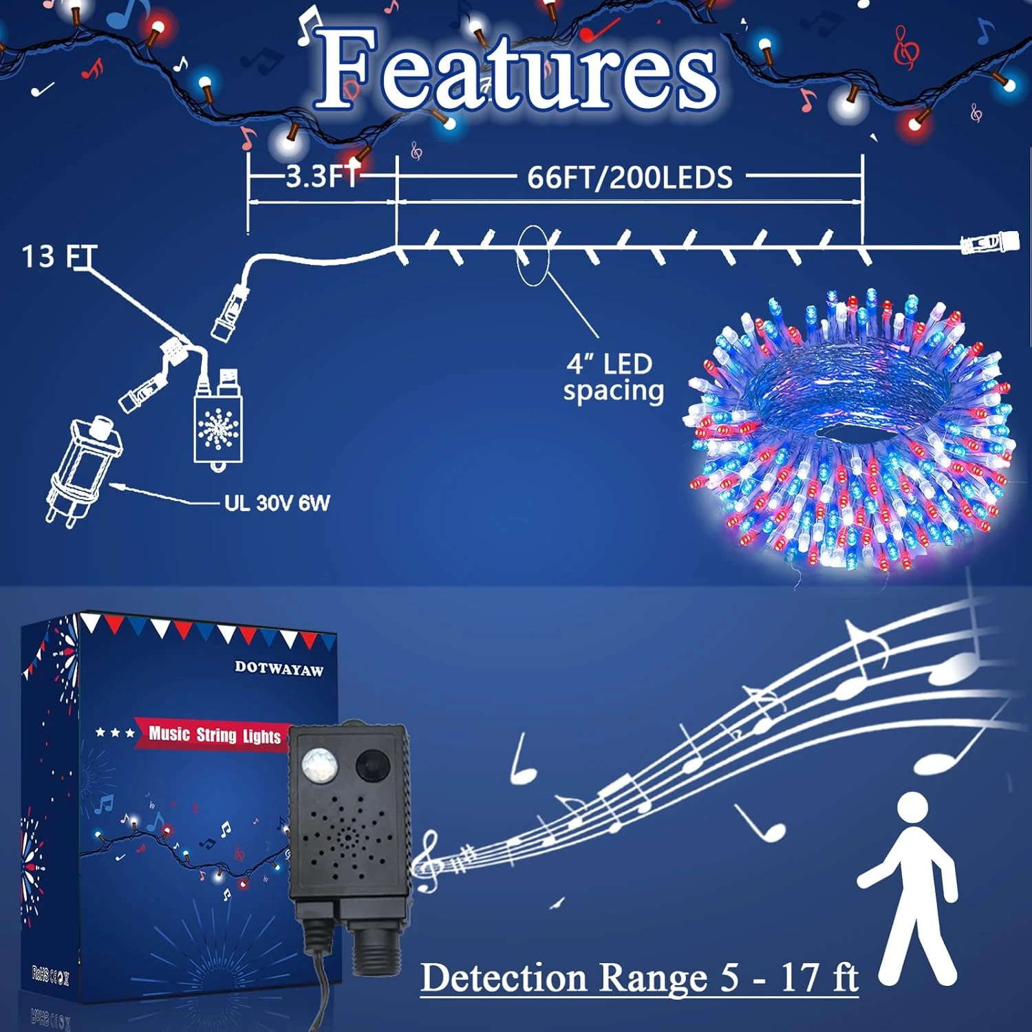 - 【Creative Patriotic Decorations】200 LED red white and blue lights , 66Ft light length, 16ft wiring length, 82ft in total. Fantastic decoration lights for hallways, aisles, doors, windows, stairs, handrails, paths. Lights and musics will work as soon as visitors approach, which will definitely add fun to your party.