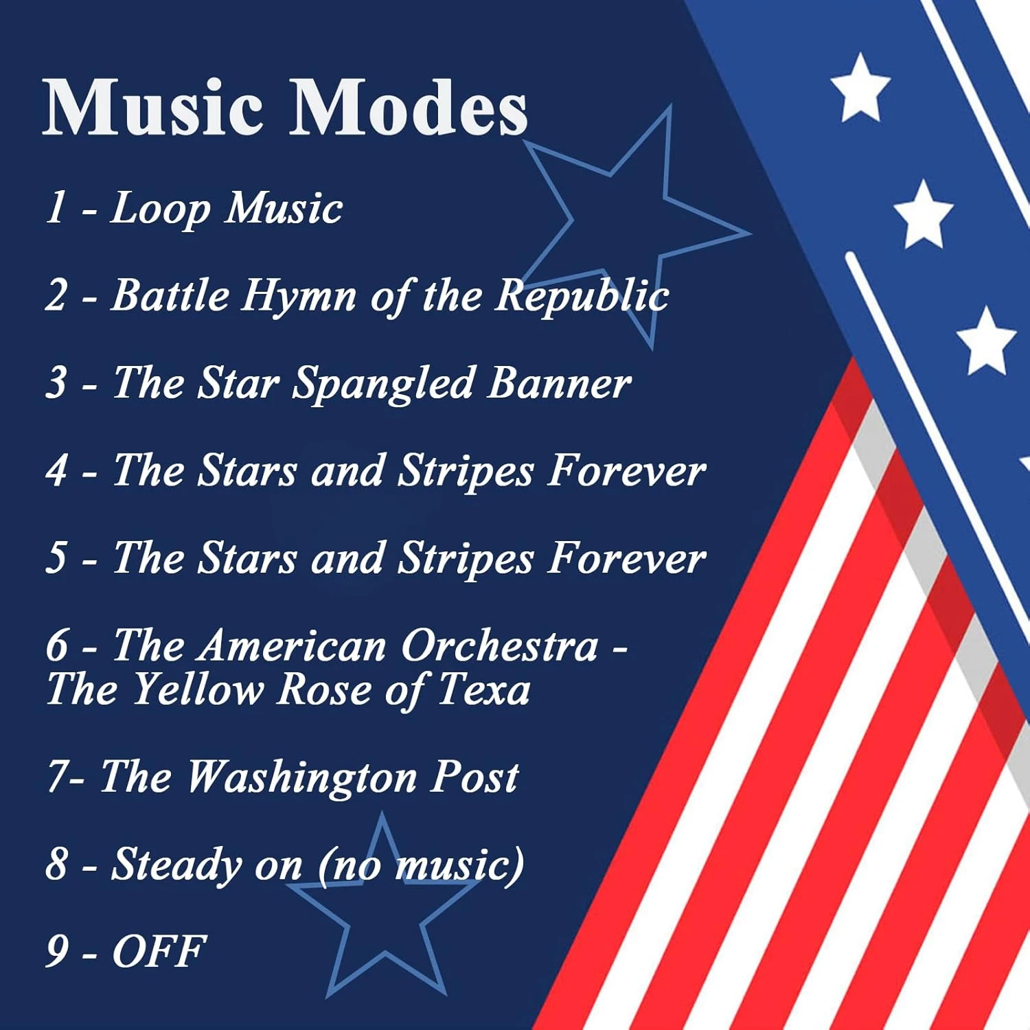 - 【8 light Modes】Plenty of music and lighting options to add a passionate feel, display your patriotic spirit. There are 6 music modes in total, Loop music, Music 1, Music 2, Music 3, Music 4, Music 5, Music 6, Steady on, OFF. You can adjust the lighting modes by pressing the button on the mode controller to create different festival effects.