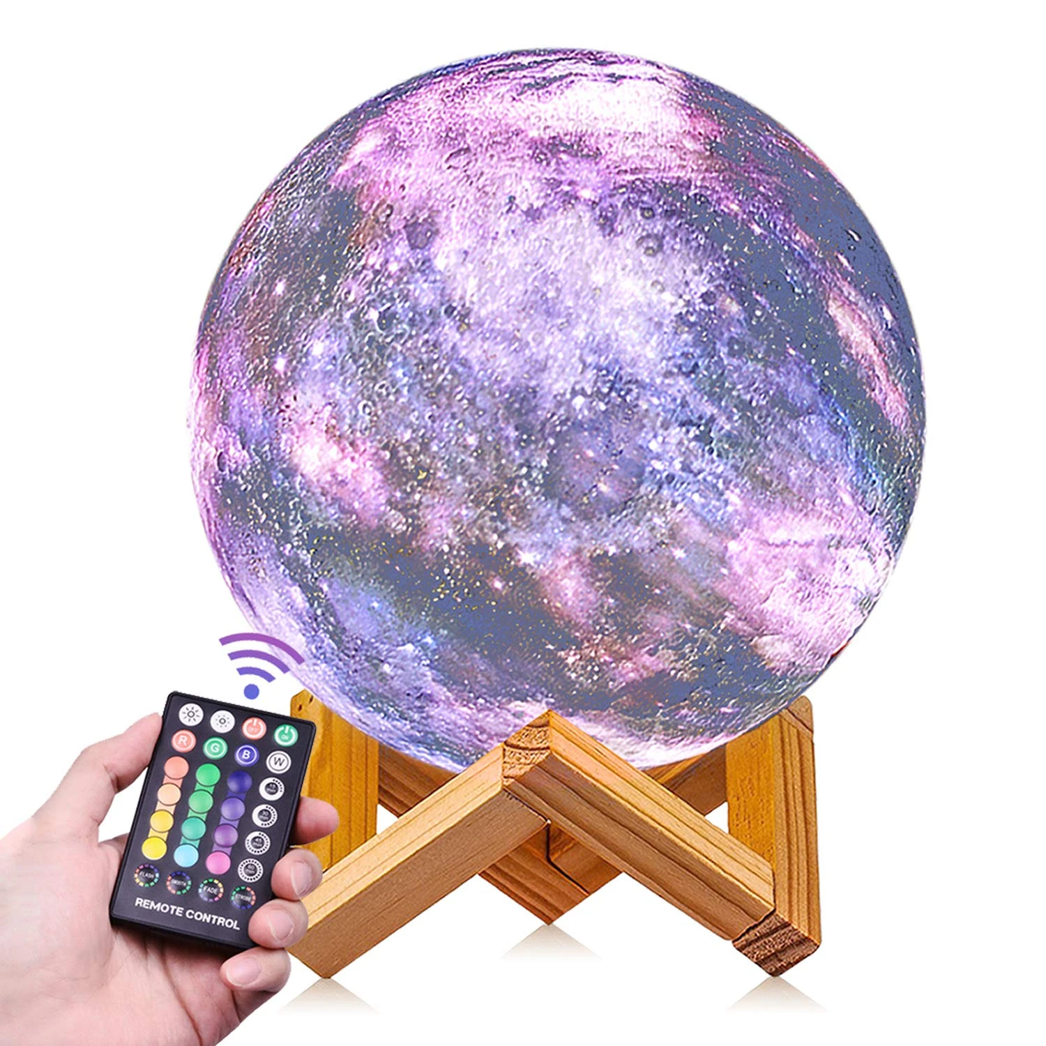 - 【Charming and Novelty】- Galaxy moon lamp make of 3D printed and using NASA data simulated the texture of the real moon shade. The colorful star sky effect gives people unlimited imagination to the universe or distant galaxies. With the wooden base and environmental PLA material lampshade.