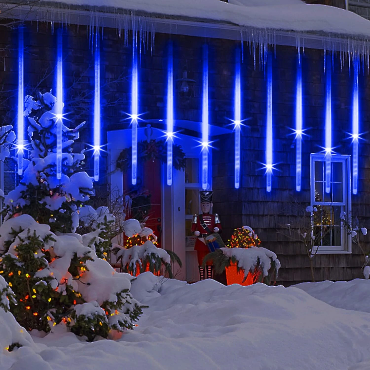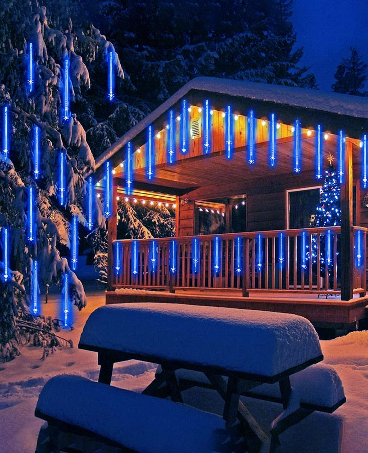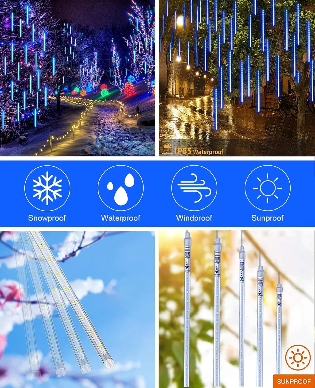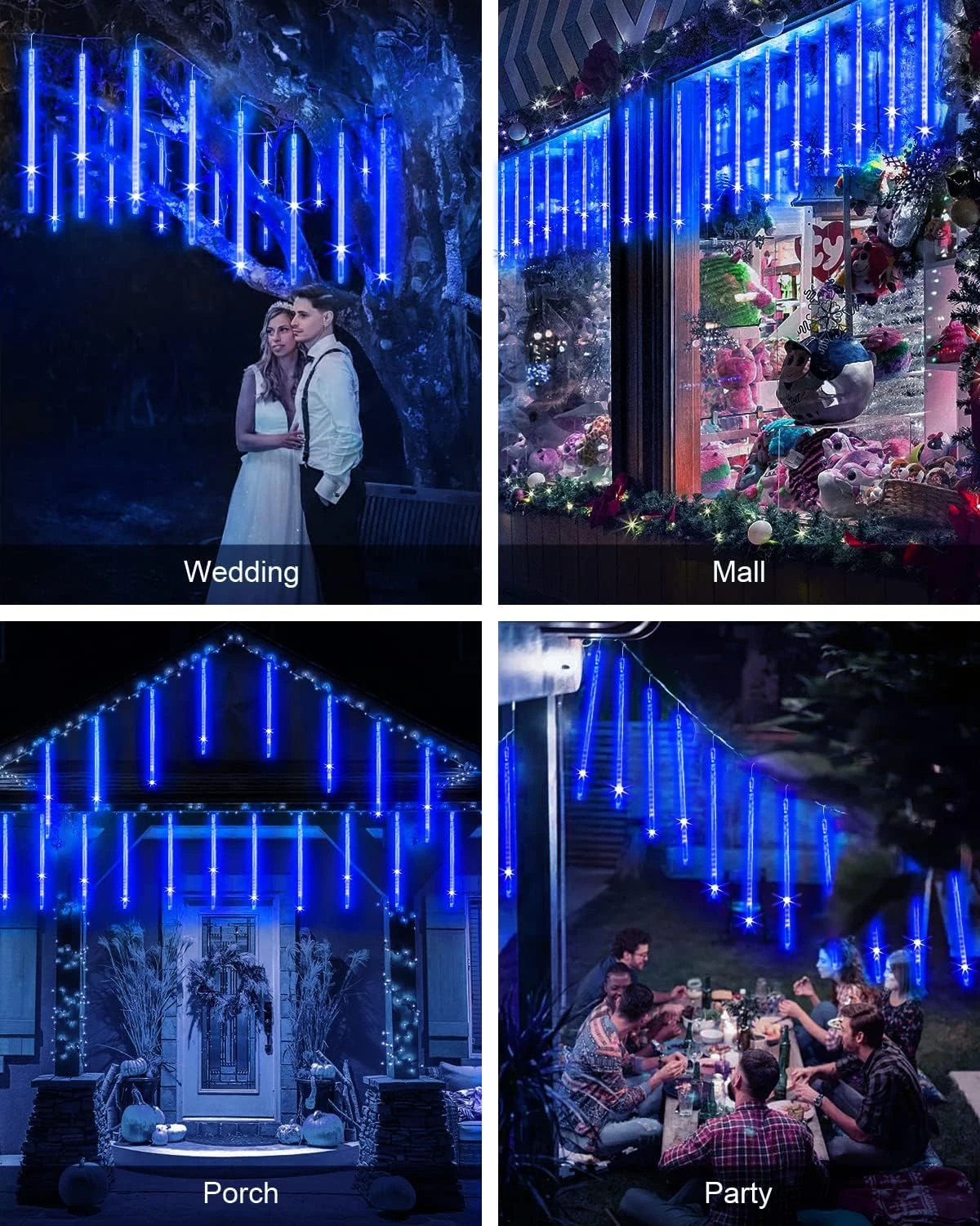 - 【EASY TO INSTALL & VERSATILE】Our Cascading lights are lightweight and come with hanging holes, making them easy to hang. They can be used as falling rain light, icicle snow fall lights, rain drop string light, and more. The LED lights flash one by one, alternating in cycles, creating a festive atmosphere for Christmas, Halloween, garden, shopping mall, wedding, eaves, yard tree, and more. No matter what scene you want to decorate, these meteor lights will be your ideal choice.