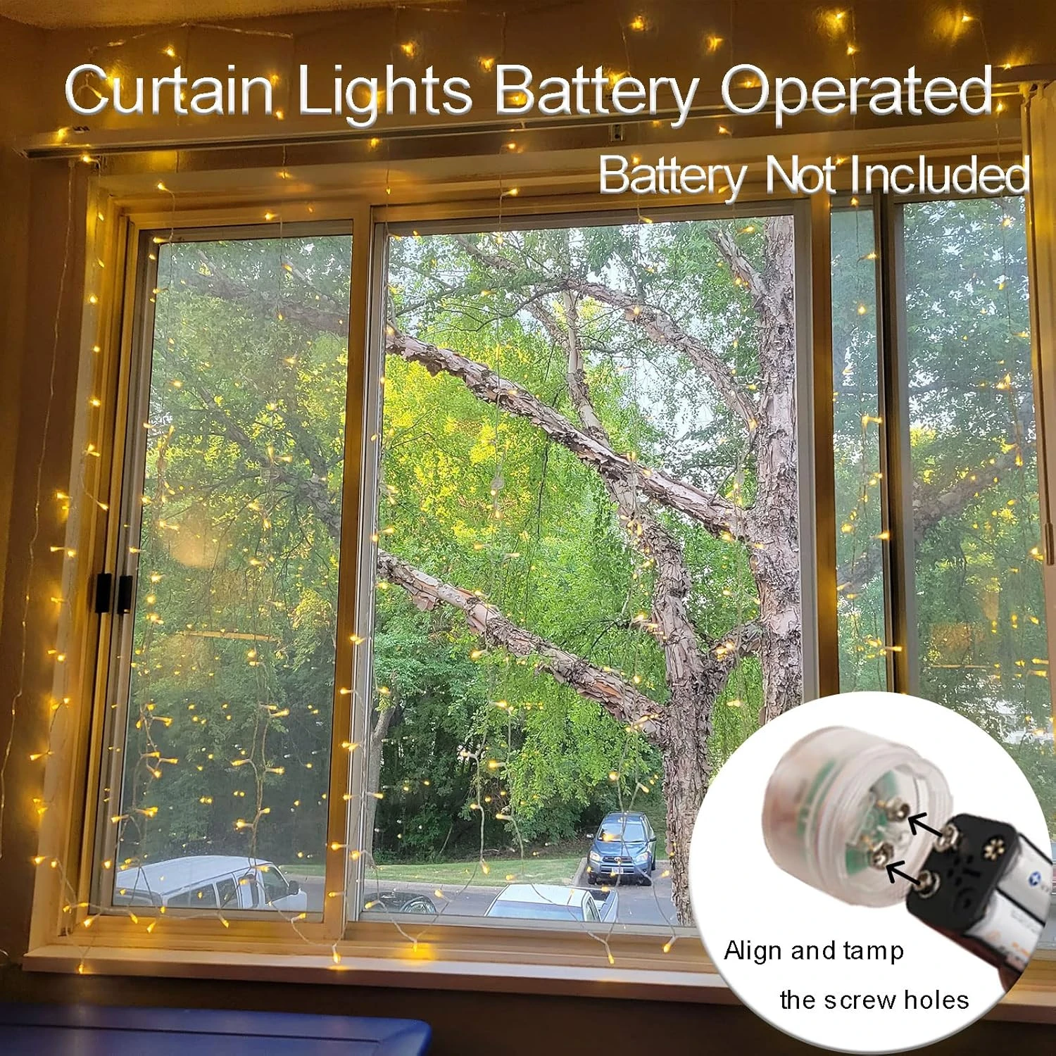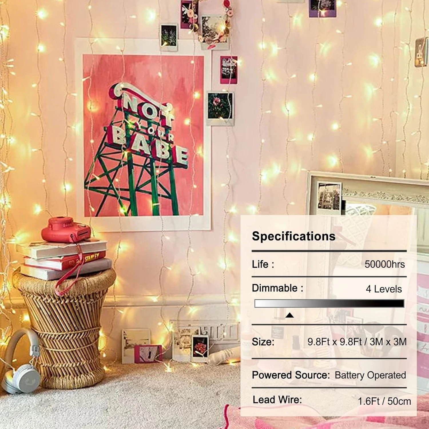 - Strand of 300 LEDs fairy string curtains lights, Size: 3m x 3 m / 10ft x 10ft, transparent cable waterfall window lights.