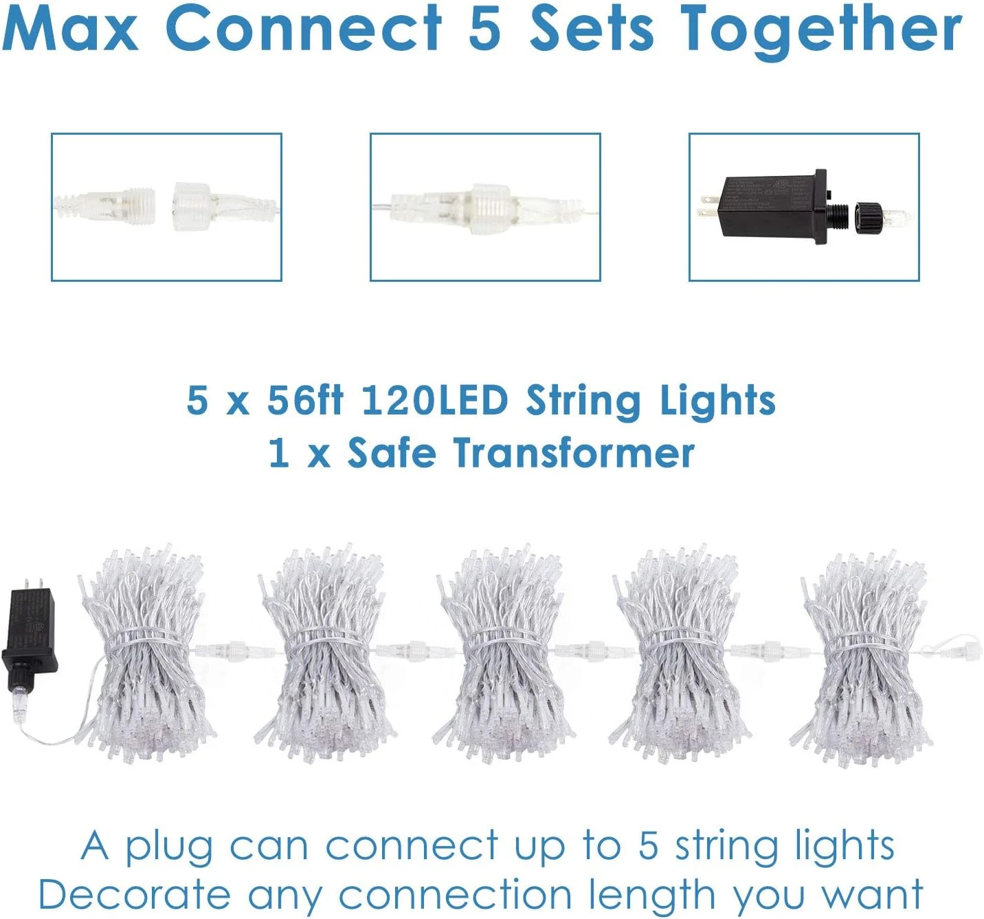 - [Extendable Clear Wire Christmas String Lights] Each 56 feet 120LED Christmas lights with excellent LEDs and durable wire, it can be totally invisible on trees, plants or any dark background. It is designed with male and female plug that could be extended to a maximum of 5 light chains (maximum 600 LED). It can be securely connected with series, adjusted length for you to decorate everywhere.