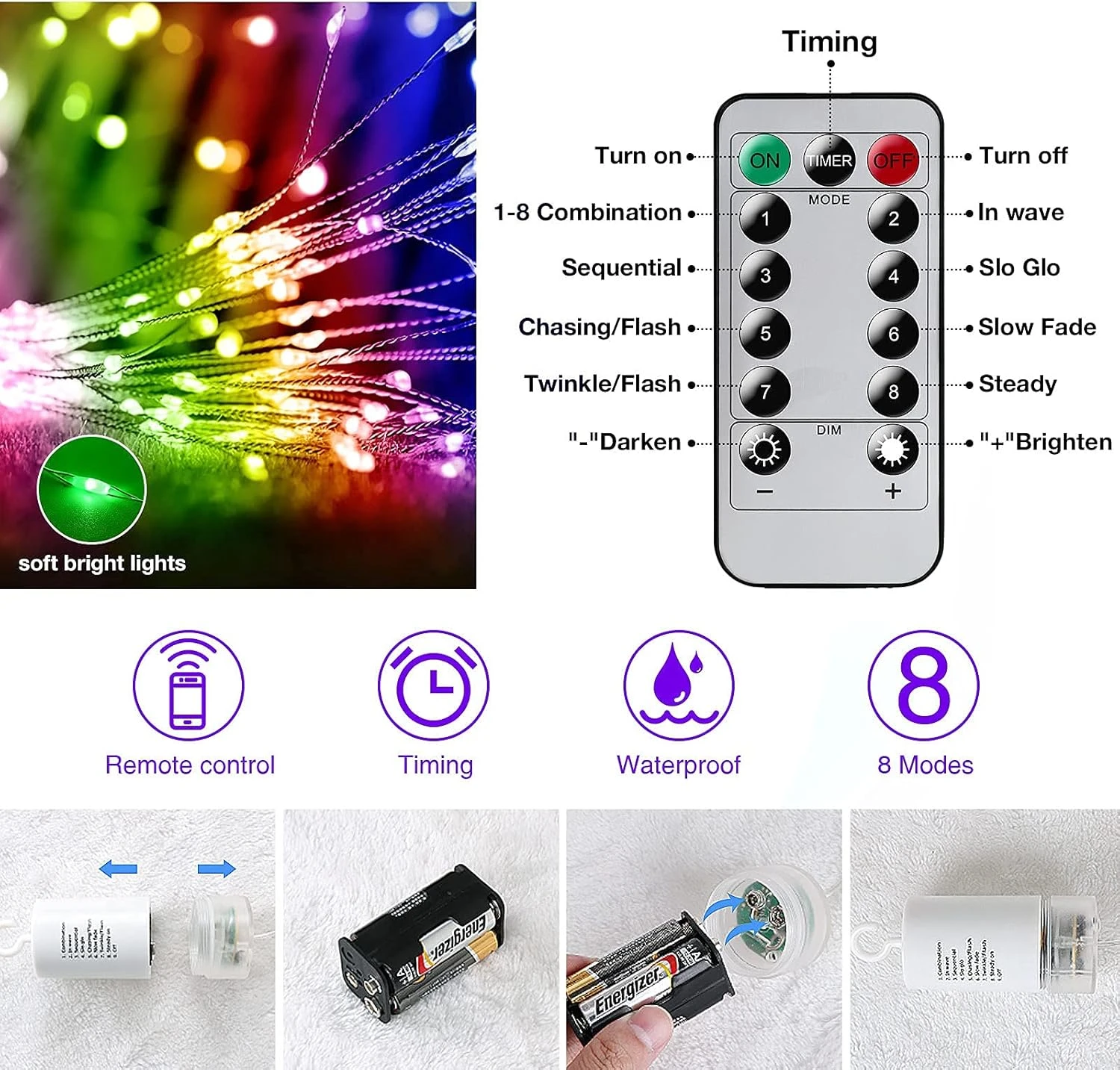 - ★ Night Mode & Widely Use – Upgraded fairy Christmas string lights with 8 different modes (steadyinking/flash/smooth/strobe, etc), can create vibrant dynamic atmospheres.The LED fairy lights also have a hook, it can be installed in the living room, bedroom, corridor, courtyard garden, bar, windows, etc, Perfect use of outdoor, patio, garden, Christmas tree, wedding etc.