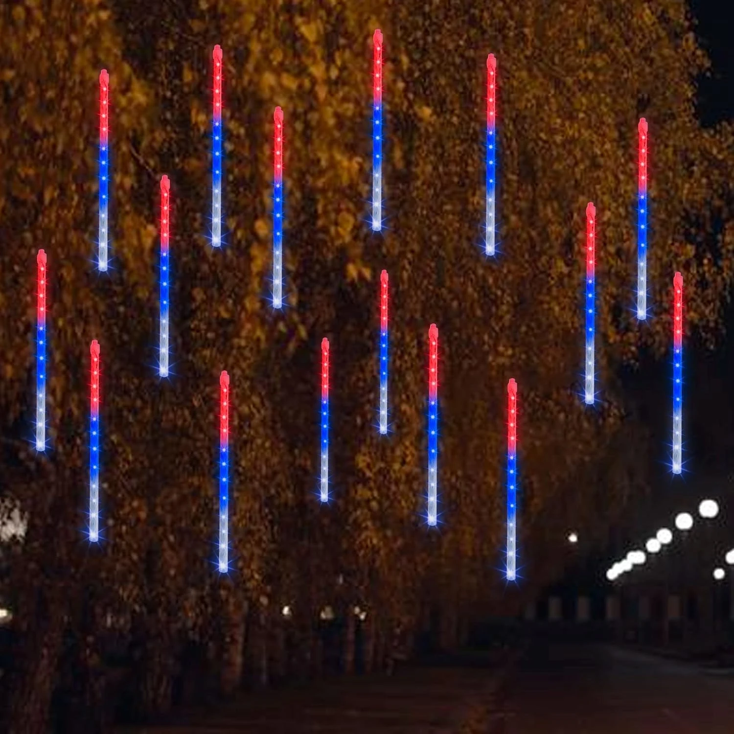 - Material: FUNPENY 4th of July meteor shower rain lights is made of premium PC transparent plastic, the red white and blue glow can be seen clearly through the plastic tube. Very suitable for July 4 th Day, Memorial Day, Independence Day outdoor decorations.