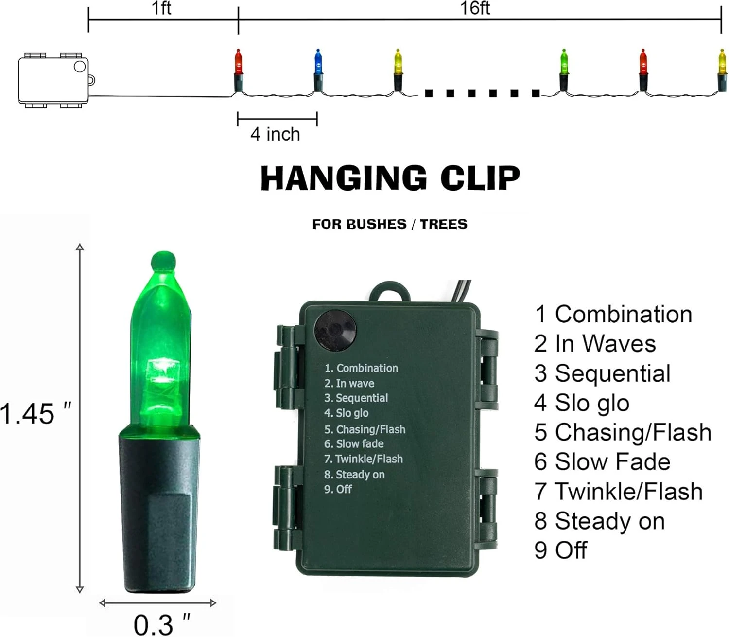 - 8 Lighting modes: FUNPENY Christmas string light has 8 lighting modes (combination, in wave, sequential, slo glo, chasing/flash, slow fade, twinkle/flash, steady on). Adjust the lighting mode by pressing the round button on the battery box.