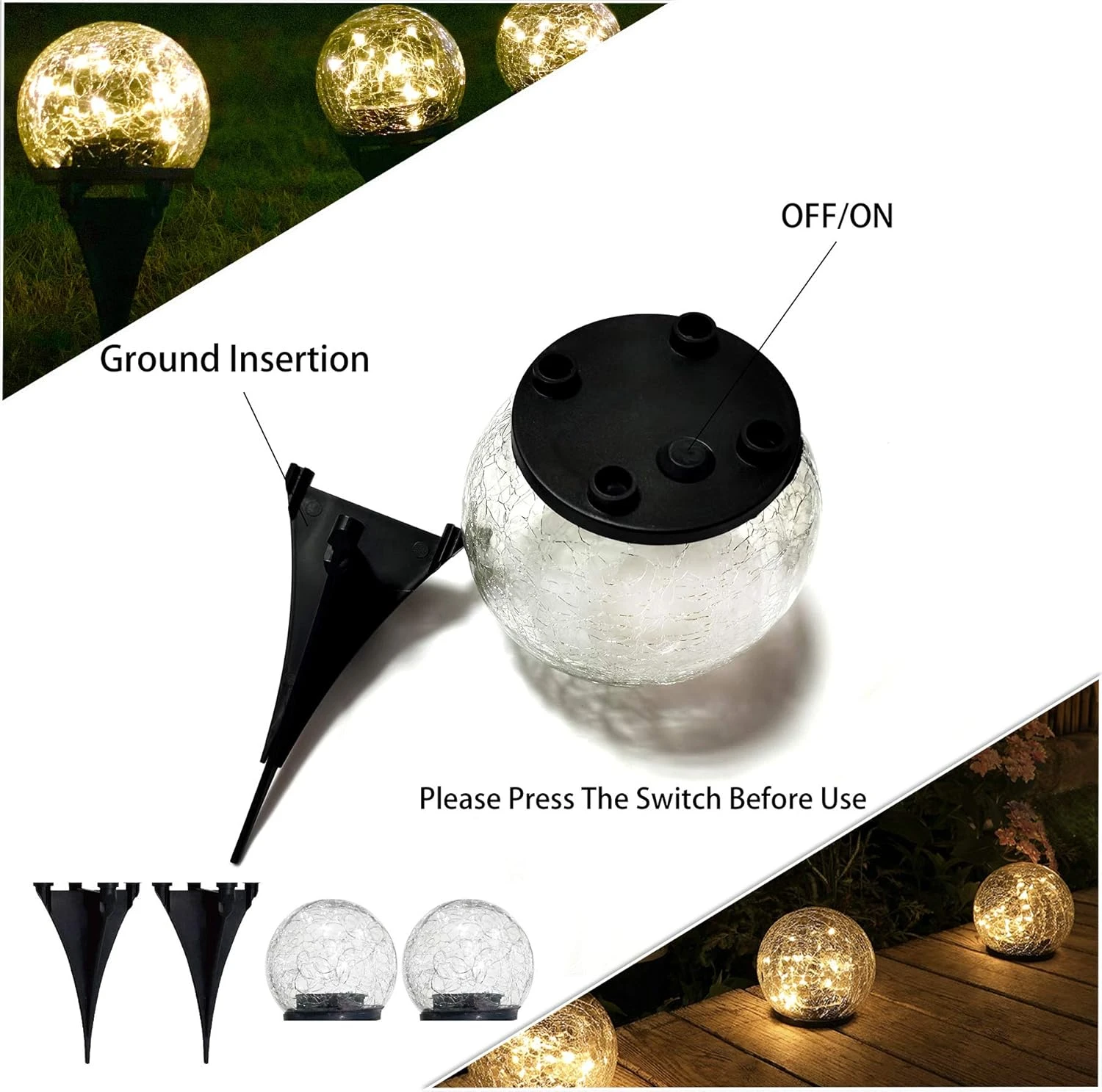 - 💡【Waterproof&Innovative Design】The garden solar lights decorative uses an innovative design made of crackle glass globe,cracked glass solar ball lights dimension: 3.93″ Dia. x4.27″H,the glass yard ball has 20 Led bulbs inside, ip44 waterproof.Giving off a cozy warm white light that creates a relaxed and romantic atmosphere.