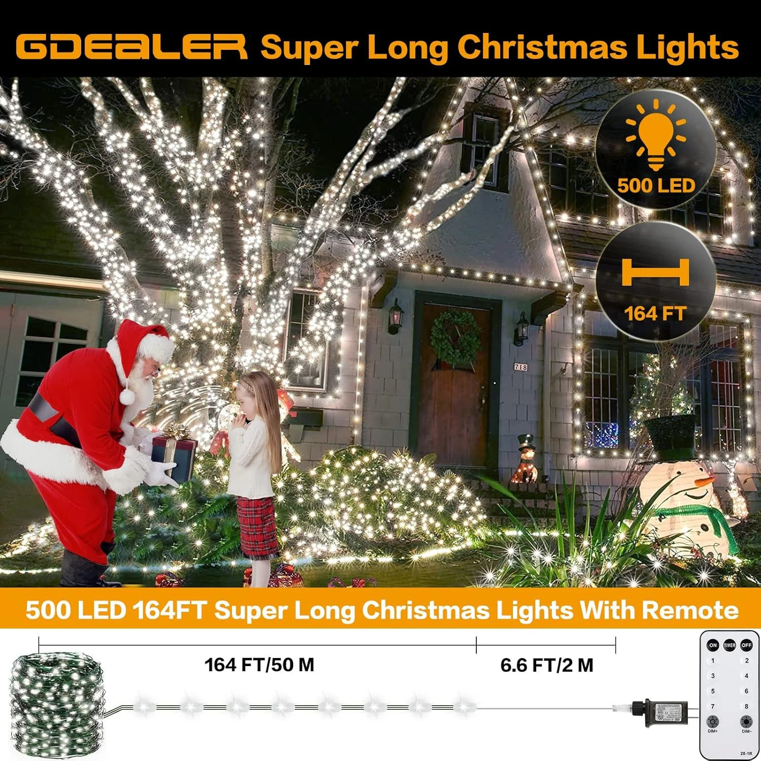 - 【Super Long & Bright Christmas Lights】 Each Christmas fairy light is 164FT super long green copper wire with 500 LED cool white twinkle lights. Green led Christmas lights are perfect for decorating Christmas trees, garlands, your garden and more, giving you a romantic festive atmosphere.