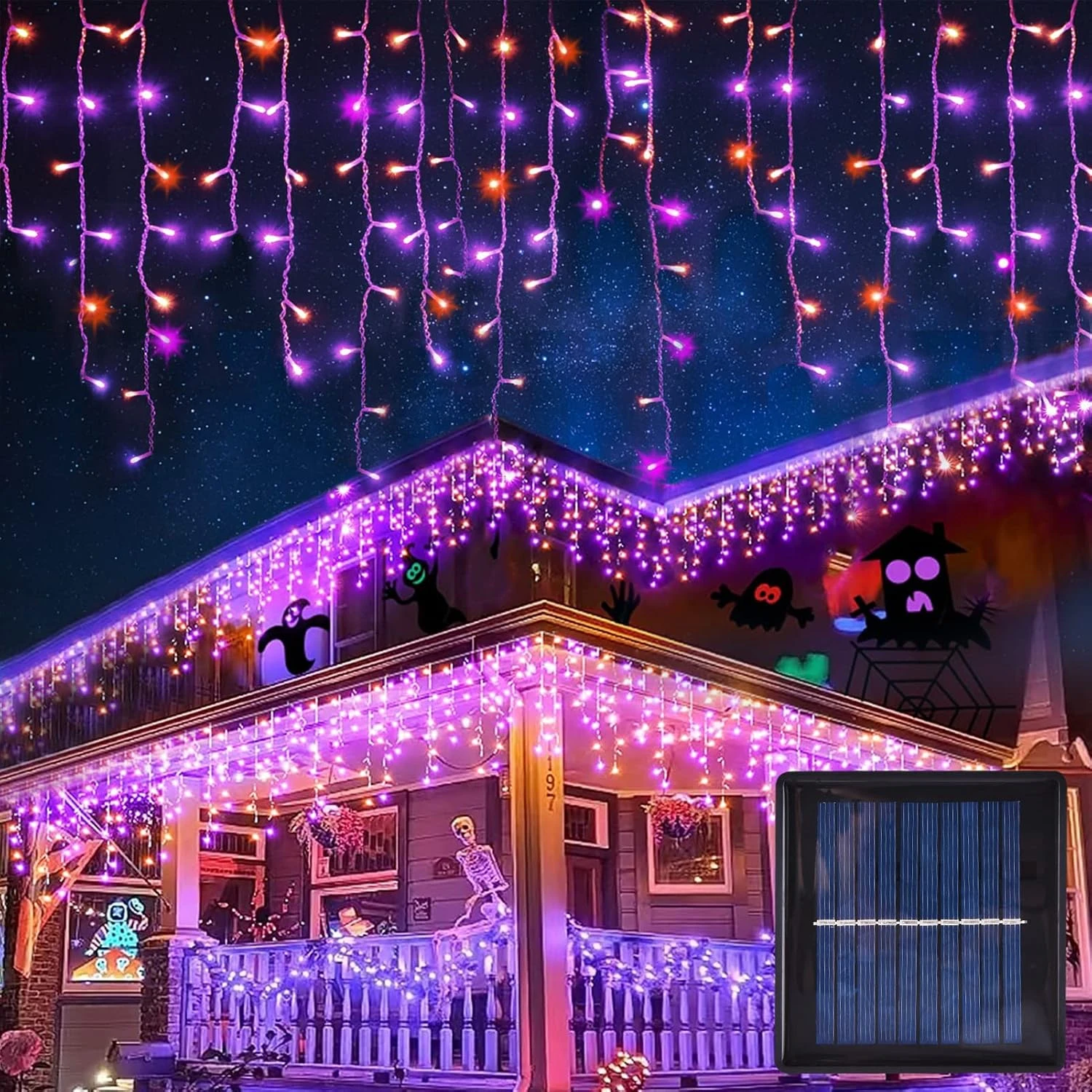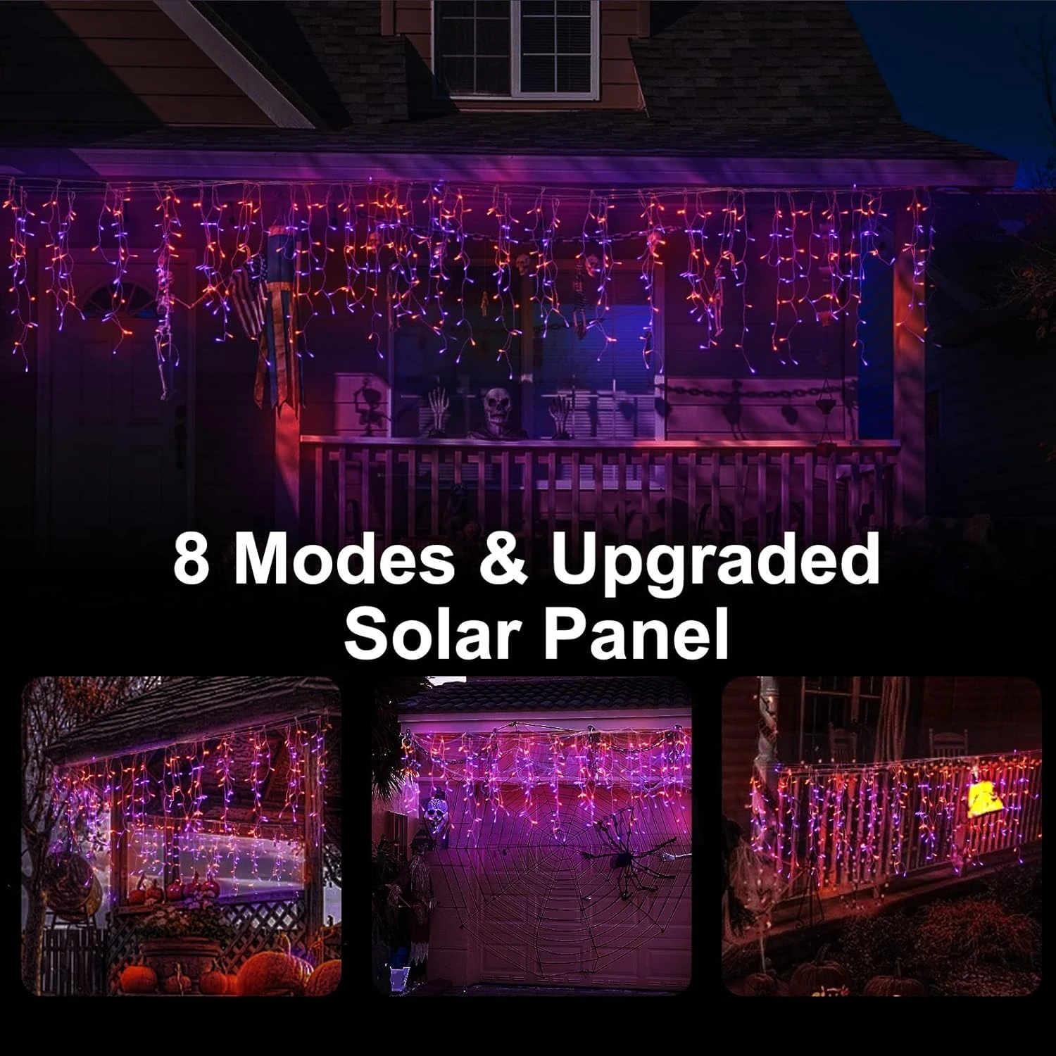 - 【Halloween Decorations Outdoor Lights】 Our solar icicle lights outdoor with 360 bright orange and purple LED bulbs, Total 60 drops with 4/6/8 led each drop. Light length 29.5ft, lead cable 16ft, total Length 45.5ft.Long enough to fit any indoor and outdoor space, creating Halloween atmosphere and vivid visual enjoyment.