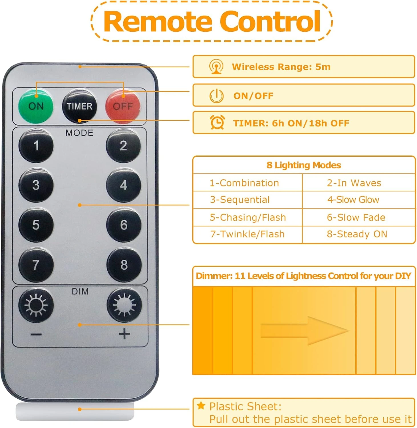 - 【8 Lighting Modes Remote Battery Lights】You could choose different modes and brightness as you wish with remote.(Combination bright, waves, sequential, SLO-GLO, chasing lash, slow fade, twinkle, steady on.) Decoration with this outdoor hanging lights, you can spend happy time with your kids, family and friends.