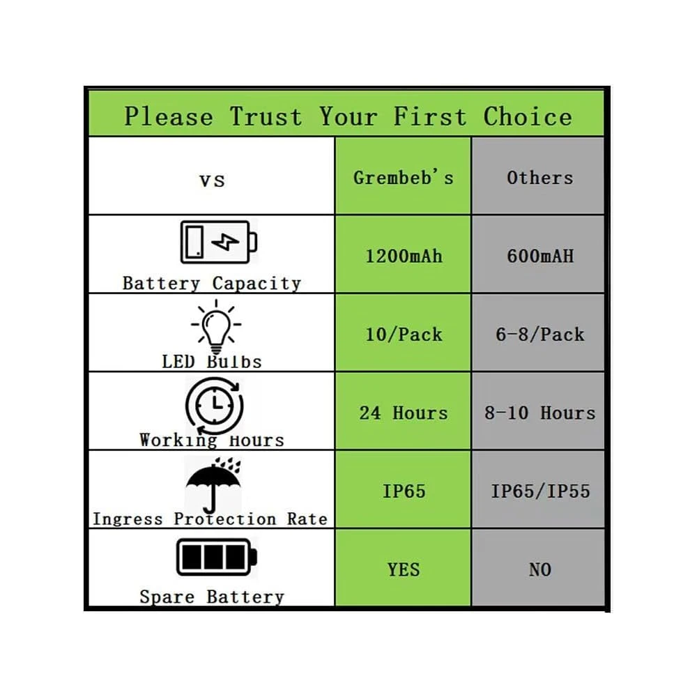 - 1.【+++ Upgraded 1200MAH Battery Capacity】:1.Compared with other fairy lights outdoor,Grembeb upgraded solar garden lights larger-size solar panel & solar battery capacity from 600MAH to 1200MAH for extend work hours from 6-8H to 18-24H; 2.Solar powered outdoor lights with 10 LED bulbs,which makes our firefly lights solar for outside more lasting & bright than traditional 6 or 8 small LED solar lights; 3. Equipped with extra & spare 600MAH batteries for longer life 🙂