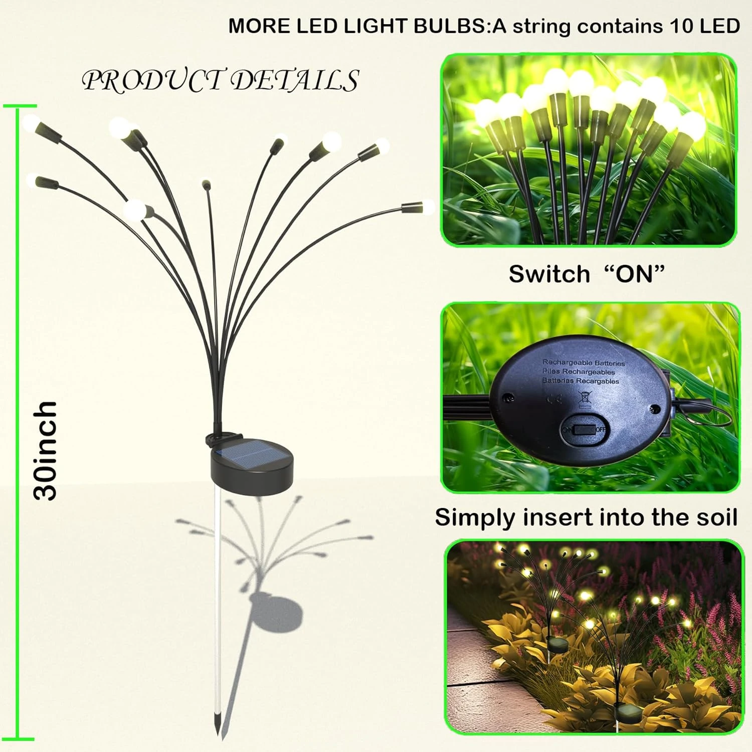 - 3.【Easy to Install & Use】:1.Wind Dancing Solar Lights can automatically light on/off based on outdoor lighting from dusk to dawn,easily decorate your home outdoor landscape without tools needed & no electricity charge; 2.Firefly garden lights are easy to use because no cables or plugs are required, just grow solar powered firefly lights in your garden, powered by solar panels; 3.Garden solar lights are like fireflies in the backyard, lights that make your family very relaxing & entertaining.