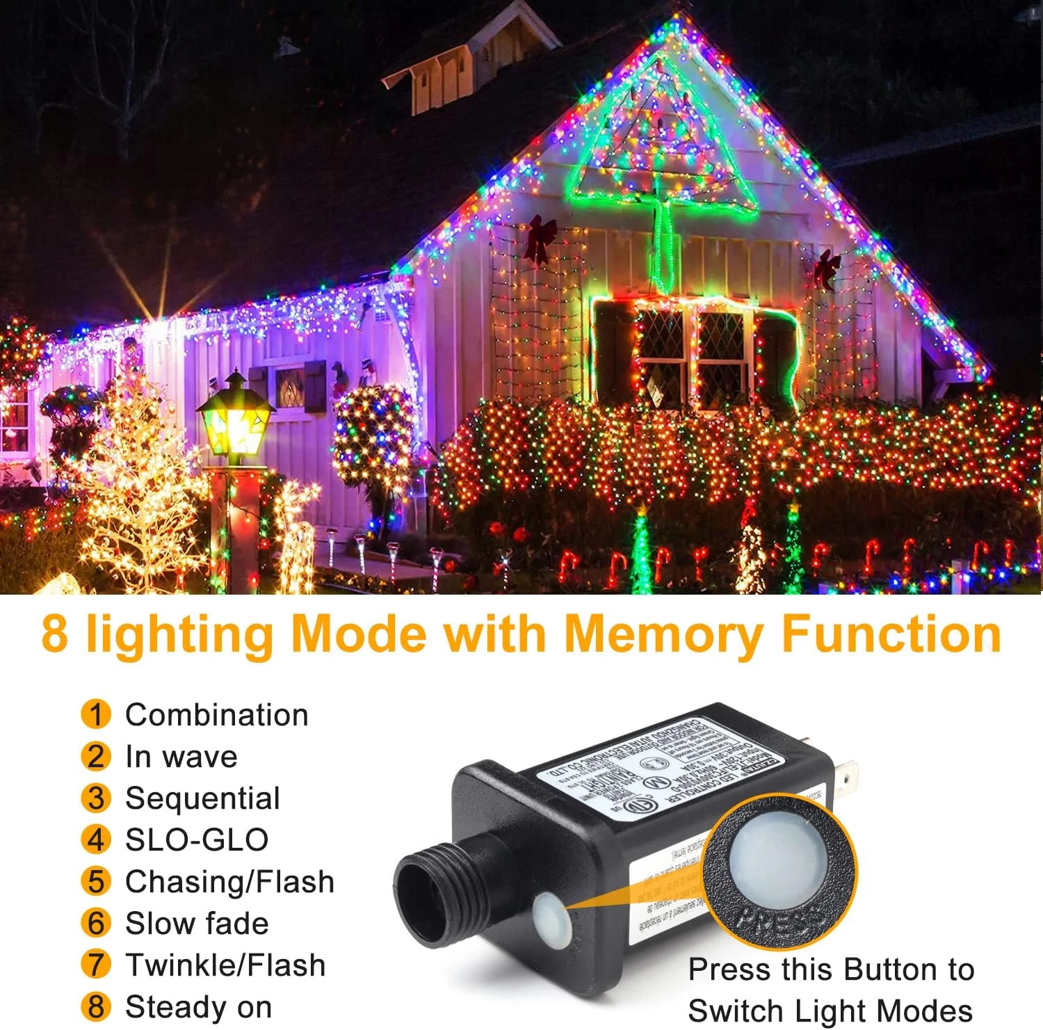 - BLUE RED GREEN YELLOW MULTI-COLOR CHANGING: MEMORY FUNCTION & 8 LIGHTING MODES: this stirng light has 8 lighting modes to choose from combination, in waves, sequential, slogs ,chasing/flash, slow fade, twinkle/flash, and steady on. Also, it comes with memory