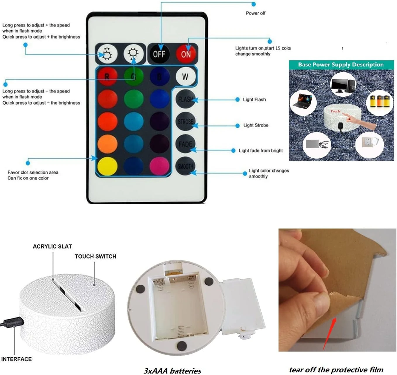 - 【Dual Power Mode】- Our 3D Lamp can be powered by 3AA batteries(not included) or USB cable connected, which is very easy and convenient. Package Included: 1x Retail box,1x Acrylic board, 1x white base, 1x remote control, 1x English Manual, 1x Micro USB cable.