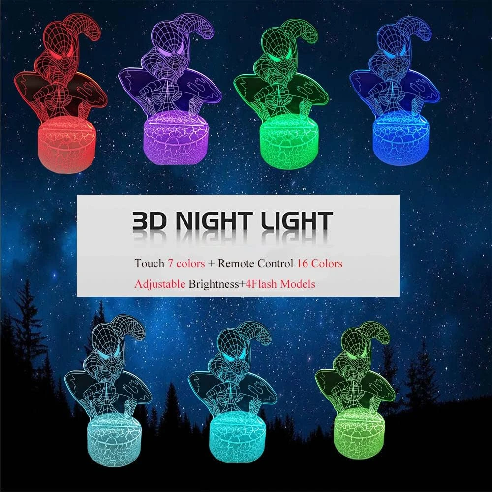 - 【Smart Touch & Remote Control】-Our 3D night light has 4 modes(flash1,flash2 fade, smooth), You can use the remote control switch 16 different colors,16colors jumping,16 colors breathing and16 colors gradient, and you can use the touch button swith 7 different corlors,(white,green,red,blue,yellow,purple and cyan)