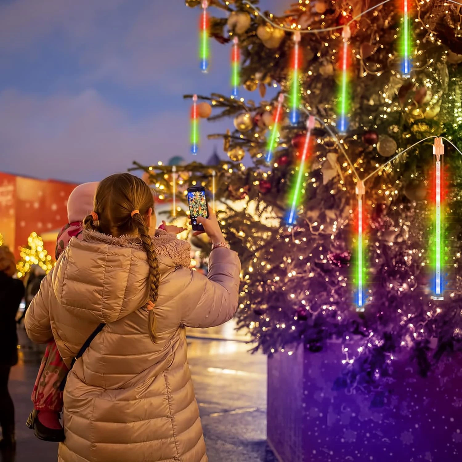 - 【Brighter,high quality and waterproof】Our Christmas string lights made of SM2025 LED chips,provide 360 degree shining angles,makes our meteor lights more brighter and beautiful.Transparent premium PC material tube,IP65 waterproof,windproof,sun-proof,cold-proof,sturdy and not easy to break.Which can withstand extreme temperatures, rain, wind, and damp climates, perfect for outdoor decoration.The flexible and strong rope is very good to fix the light tubes to the tree or anywhere you can hang.