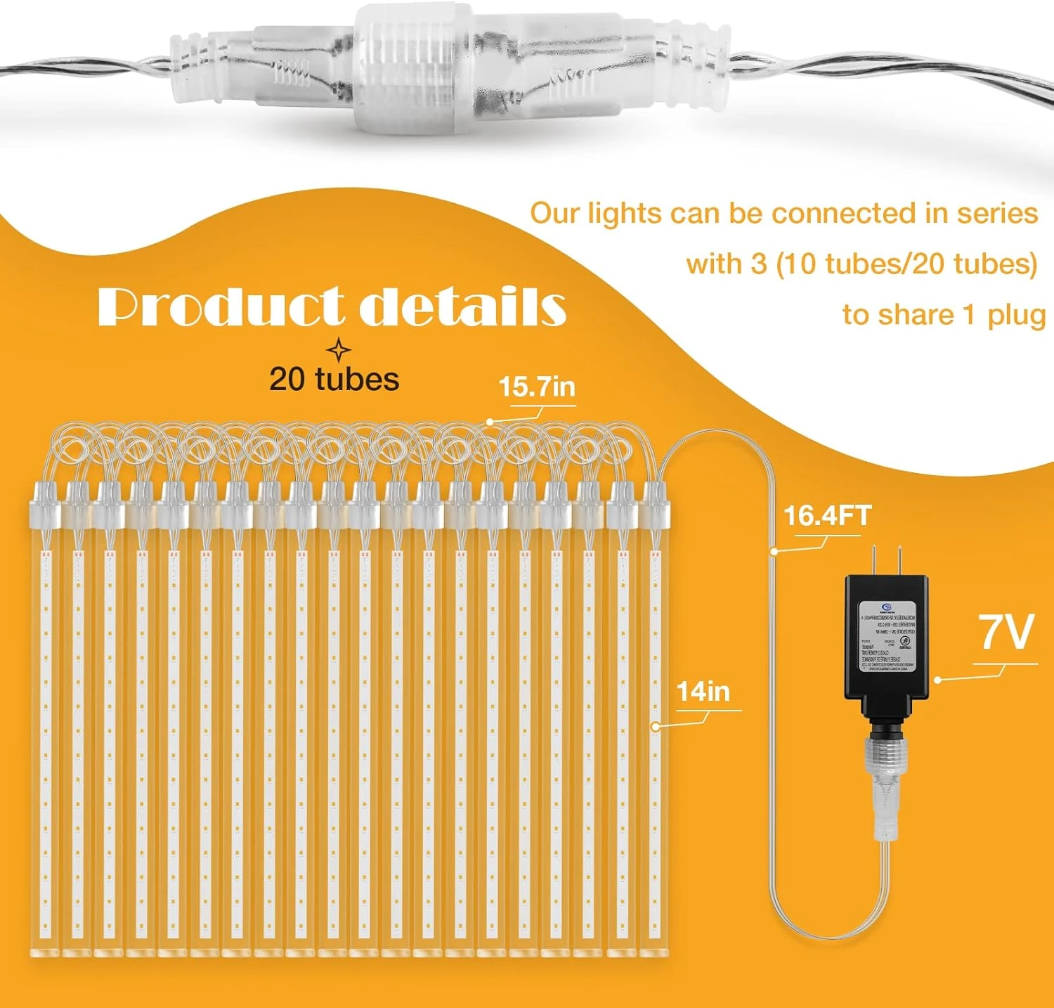 - 【14 inch long,4 colors and 20 tubes for choose meet all your needs】Our cascading lights have 20 tubes, 35cm per tube, 34 LED per tube.Cool white, warm white, blue, blue and white colorful color options for all your color preferences.Meet your indoor and outdoor use in any occasion.designed with tail plug which can connect at most 3 lights together using one plug for greater range and more twinkling star lights.Let’s feel the stars shining,snowflakes raindrops falling!
