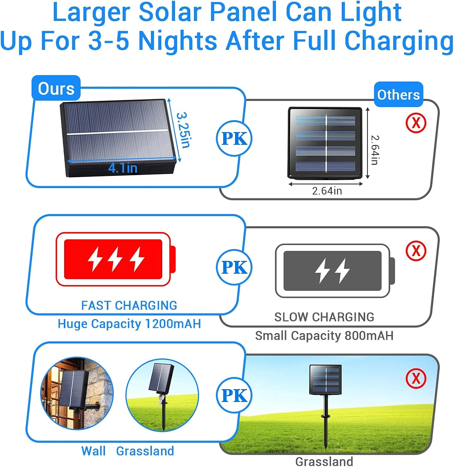 - Energy Saving & Environmental Protection – High-quality solar power, effective energy saving. It built-in 1200mah rechargeable battery, absorb solar energy during the day, and automatically turns on at dusk. The battery can be continuously illuminated for 8-12 hours when fully charged