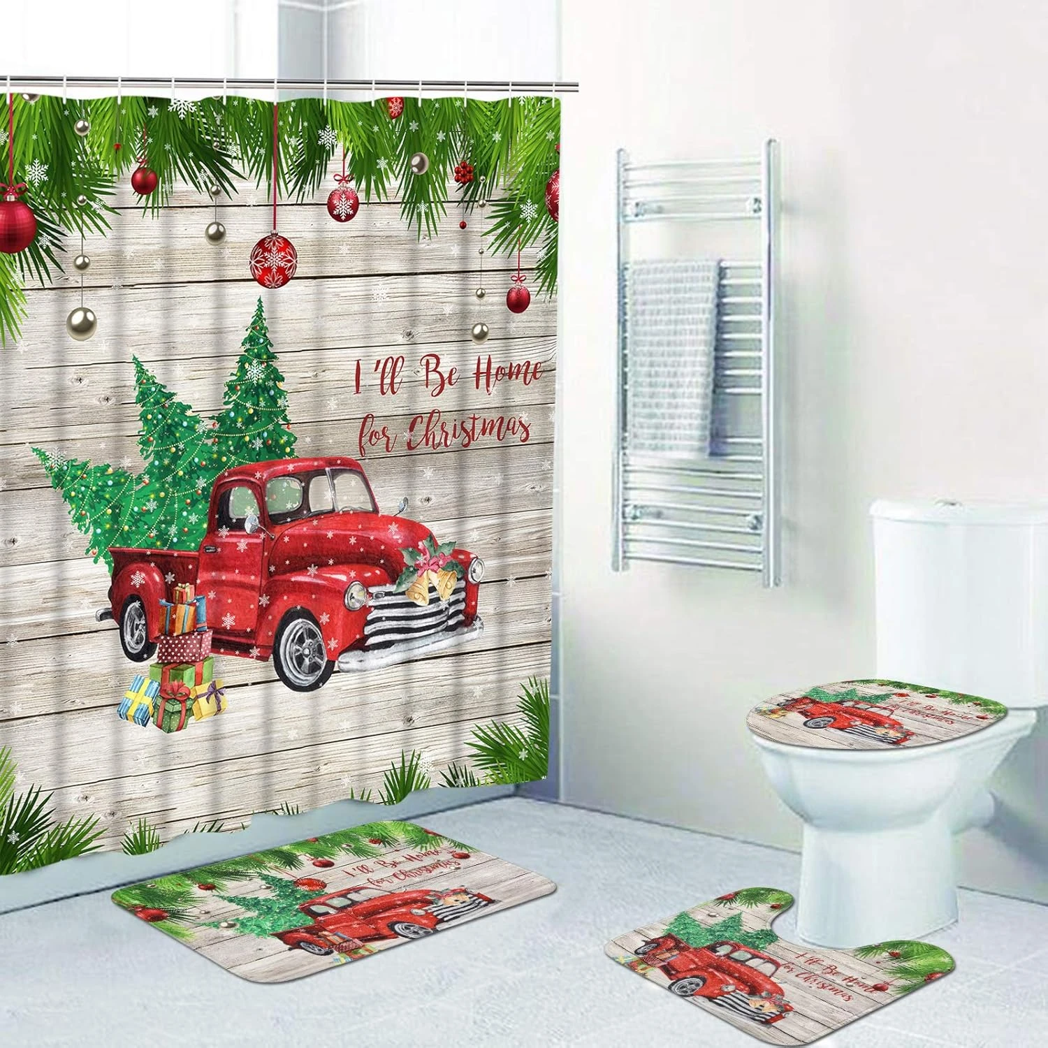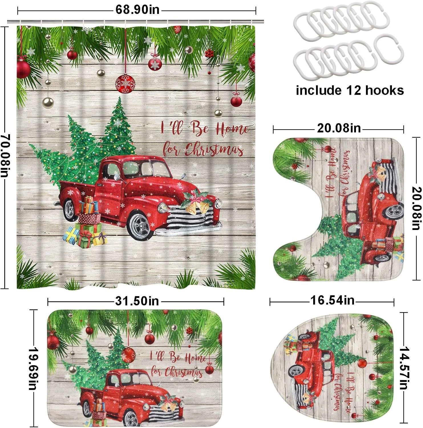 - PERSONALIZED DESIGN: This vintage rustic shower curtain set adopt advanced HD printing technology, which make the pattern clear and vivid, true and not easy to fall off and fade. Red truck carrying Christmas tree match vintage rustic wooden style background, which will not only can it bring a strong festive atmosphere to your family but also allow you to have a perfect bathroom experience.