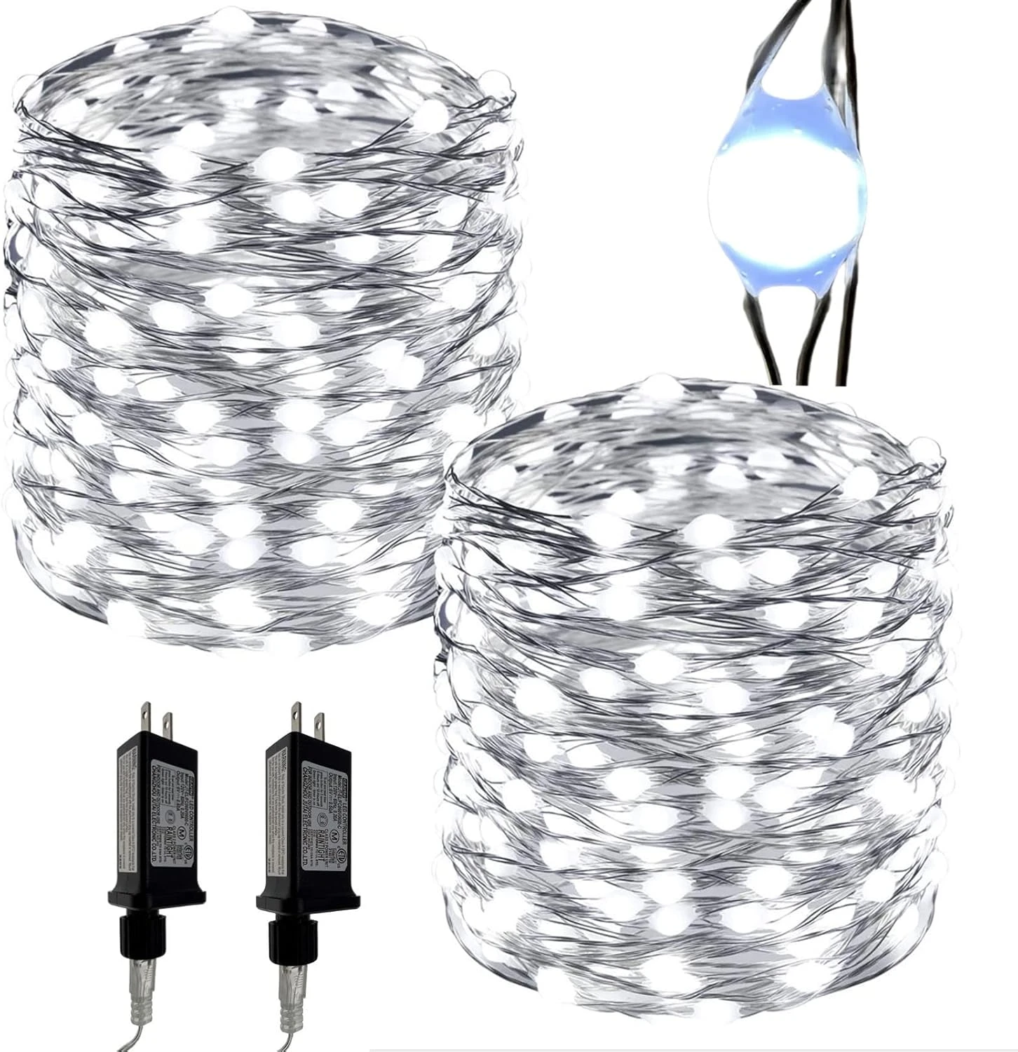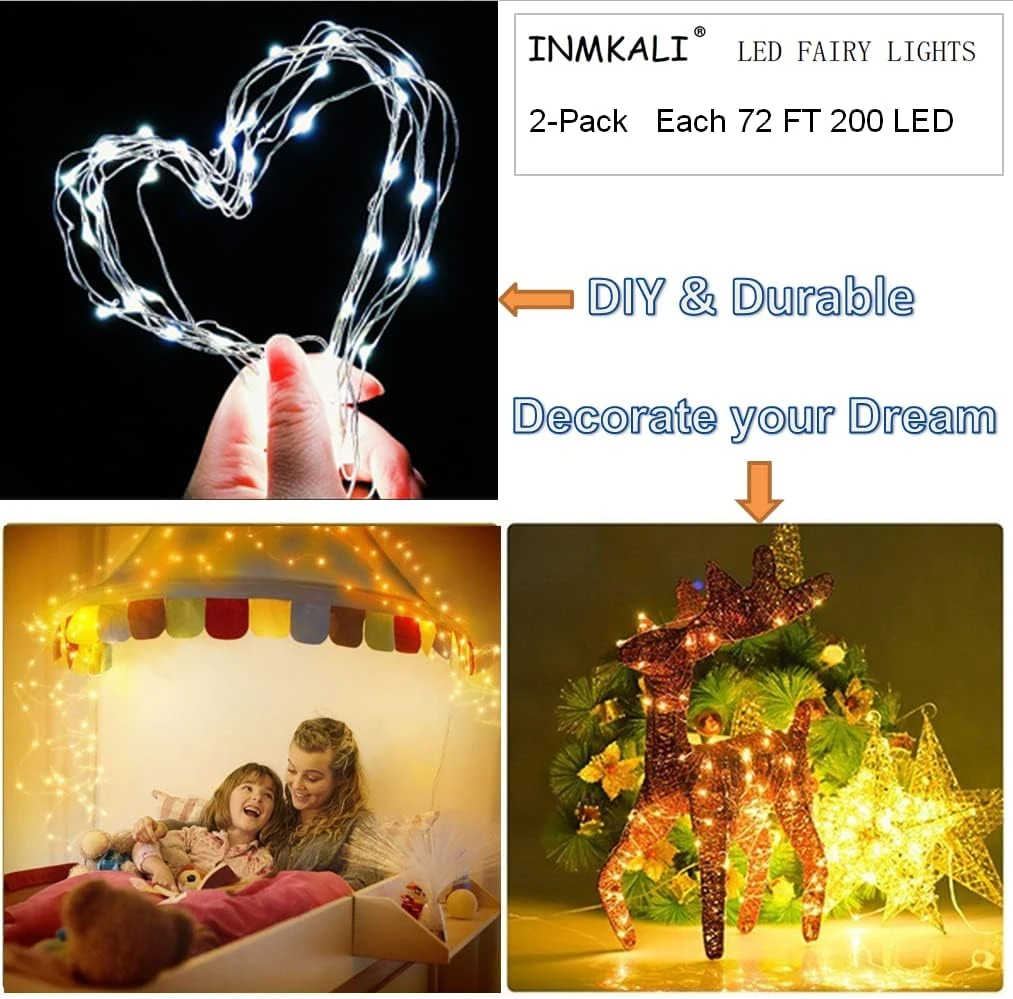 - 【PRODUCT SPECIFICATION】: Extra Long 2-Pack Cool White(Each 72FT 200LED) String Lights. The head cable is 6FT Long. There are 3.94 Inch between each Led Beads with total 66FT Led Light Long, The Out-put is very low energy with 6V- 3.6W ( 200 x3V/Max. 20MA)