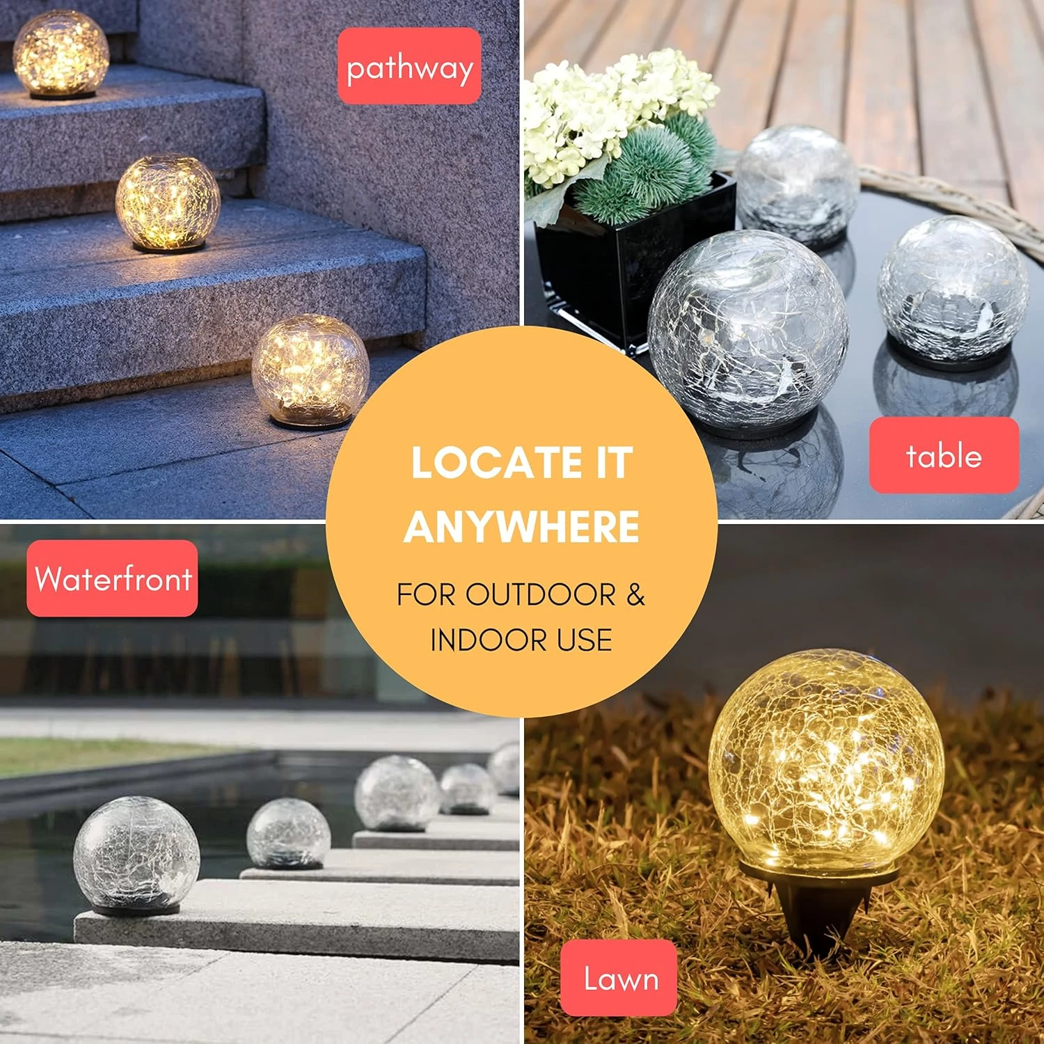 - 【 Waterproof and Durable 】The solar panel and switch are located on the base of these solar powered decorative crystal balls, it is detachable with the unique screw thread design. If the ball inside gets foggy, you can take off the base and wipe the wet off. The solar garden lamp under most weather conditions. You can use it safely as garden accessories, lawn ornaments, sidewalk, path and patio landscape lighting.