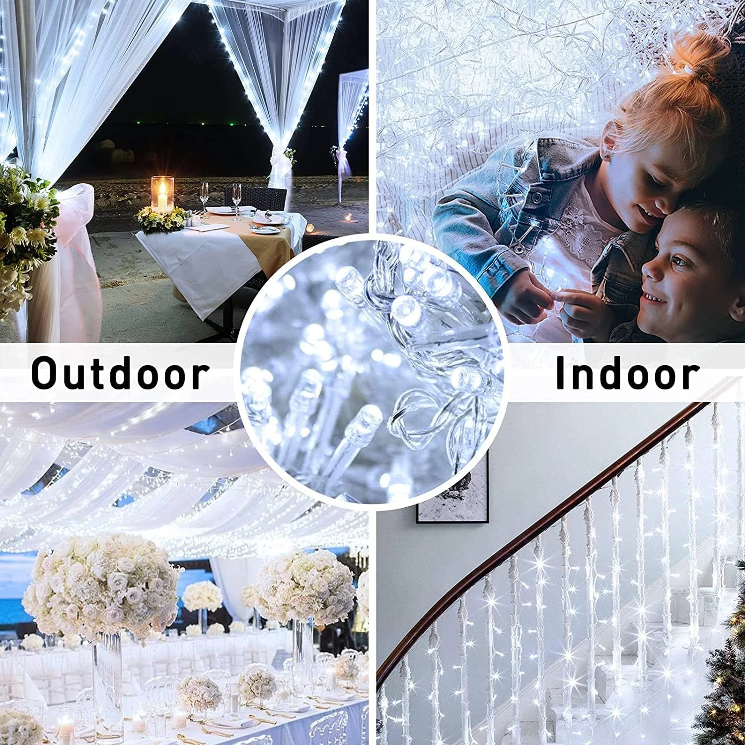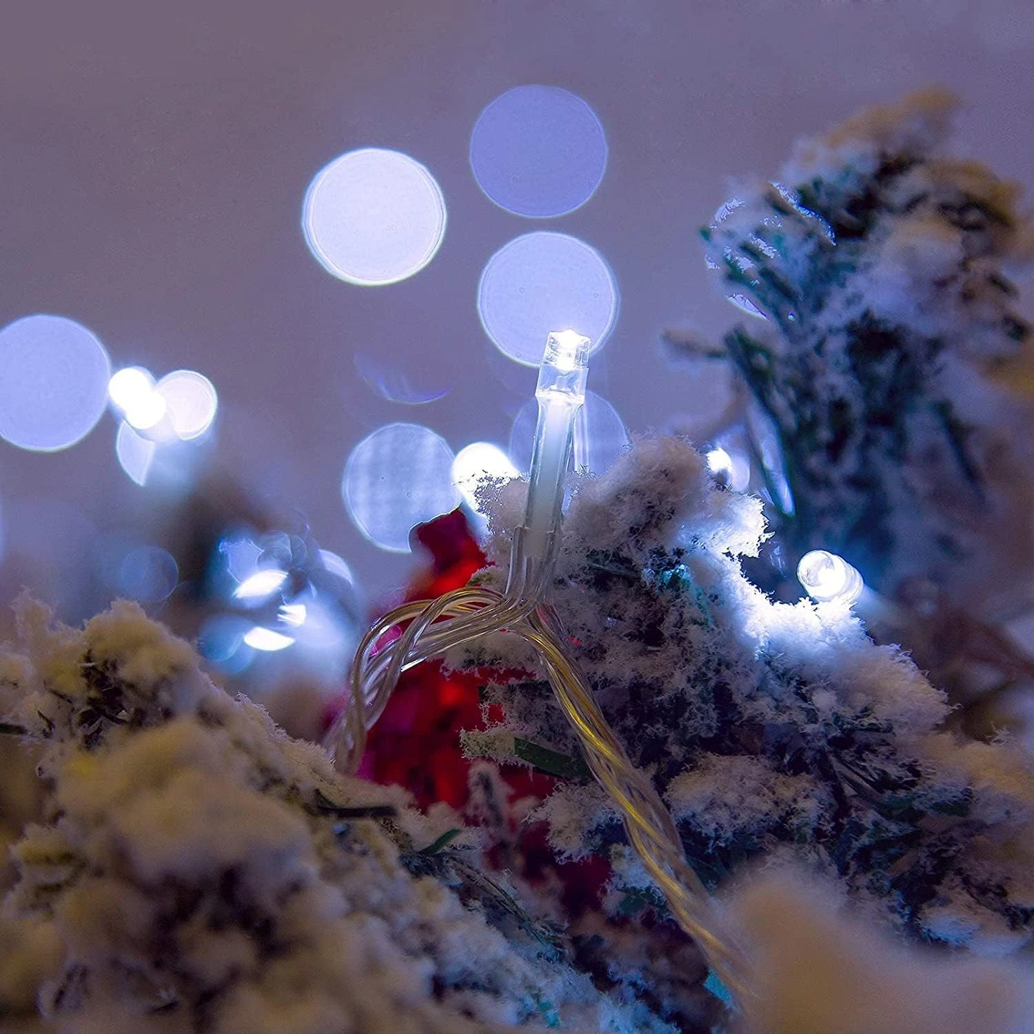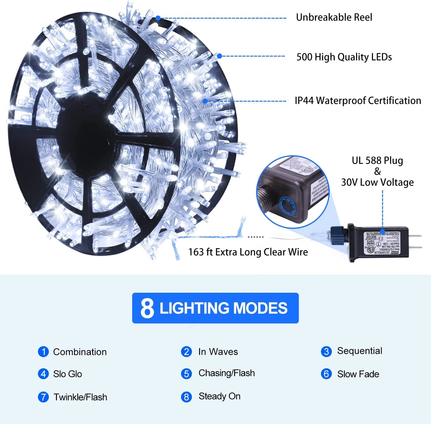 - 🎅Extra Long 500 LEDs White Christmas Lights- The 163 ft long light has 500 super quality LEDs that emit a steady and soft glow. At Christmas, these Christmas lights outdoor are long enough to be made into garden deers and can also be wrapped around a 7ft Christmas tree, thus creating a festive Christmas atmosphere. White is a classic color, and the white Christmas tree lights can easily add a pure and holy atmosphere, it is also a wonderful choice for wedding or party decoration.