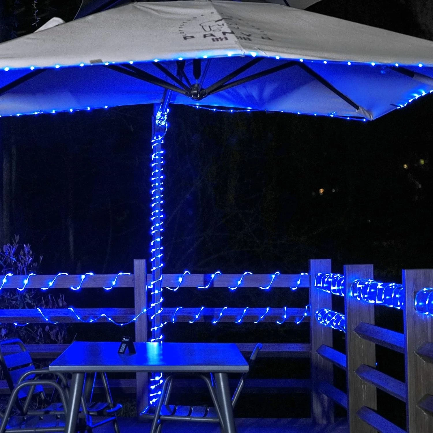 - [8 LIGHTING MODES] The higher quality blue outdoor solar rope lights have 8 gorgeous lighting modes. You can adjust the effect you want on different occasions, the LED blue lights will create a warm atmosphere. In the dark, when the solar powered light rope turns on, the wires will fade to invisible, only leaving bright lighting that can make the decoration more beautiful and noticeable.