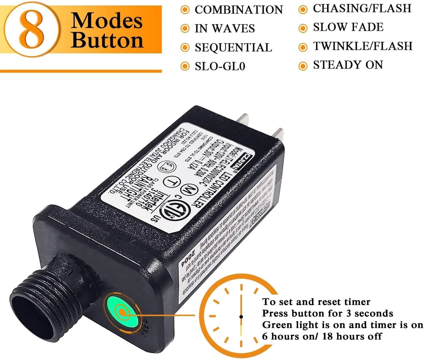 - [8 Modes & Timer Function] Combination, In waves, Sequential, Slow Glow, Chasing/Flash, Slow fade, Twinkle/Flash, Steady on, a total of 8 modes to satisfy your diverse decorative effect. Each mode is controlled by the button on the plug. Perfect for Christmas night, party night, birthday night, and wedding night. Christmas tree lights warm white have “6h on, 18h off” timer, press the button for 3 seconds to set and reset the timer. The green light is ON means the timer is ON