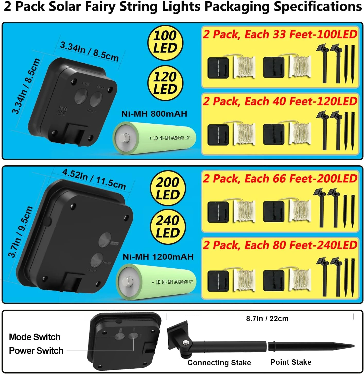 - ☀️【Upgraded Larger Panels】Our solar fairy lights equipped with 2 premium silicon solar panels and inbuilt rechargeable batteries (33ft&40ft Upgraded 3.4*3.4 inch solar panels 800mAh battery) (66ft&80ft Upgraded 4.5*4.5 inch solar panels 1200mAh battery) size which is bigger than traditional ones, 8hrs auto-charging at daytime, providing twinkle shining lights above 10hrs in night! Battery can be recharged for 600 cycles, no need for extra replacement!