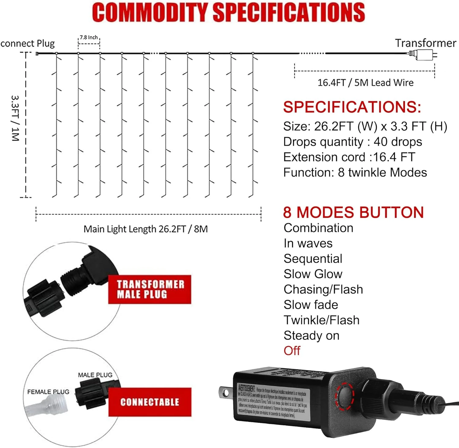 - 26.2 ft * 3.3 ft 400 LED Curtain Lights: The soft white waterfall fairy lights come with 40 light strands and each string contains 10 pcs LED lights. 26ft in width and 3.3ft in height make it wide and long enough to cover most of Patio,Garden,Roof especially the large city mall and big party.