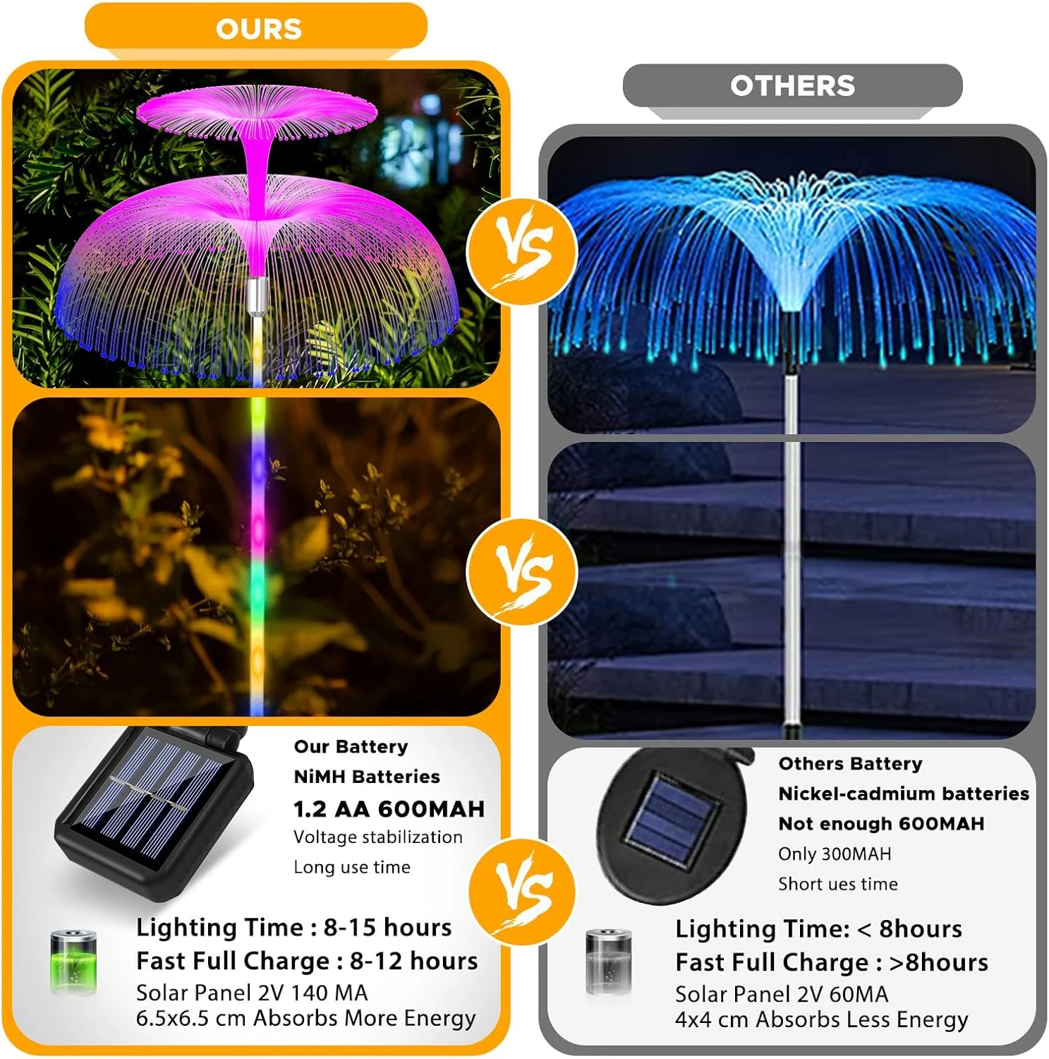 - 【Automatic Control】Enjoy effortless outdoor lighting with automatic control solar jellyfish lights. When the switch is turned on, the solar panels automatically absorb energy during the day, and the sensors switch on the garden outdoor solar lights at night for a shining garden. Enjoy 8-15 hours of brilliant lighting after just 8-12 hours of sunlight charging.