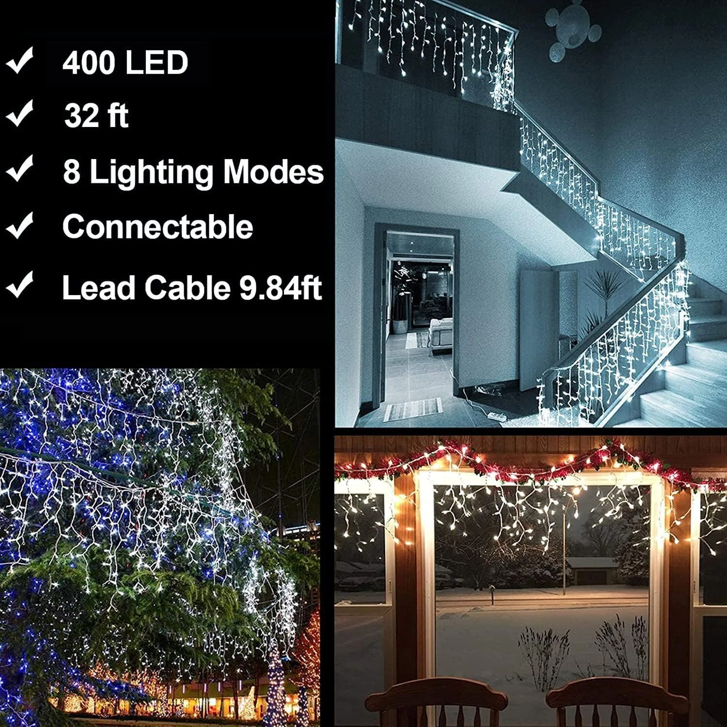 - 【Connectable & Wide application】Each light comes with a waterproof end-to-end connector to meet your needs for large and small area decor, such as Christmas decoration, Thanksgiving, Wedding, Valentine’s Day, and more. You can connect max 3 sets together. Each one length is 33 feet with 400 LEDS, the max expandable length is 99 feet with 1200 LED. Light up our home this Christmas and they are the talk of our neighbors and friends.