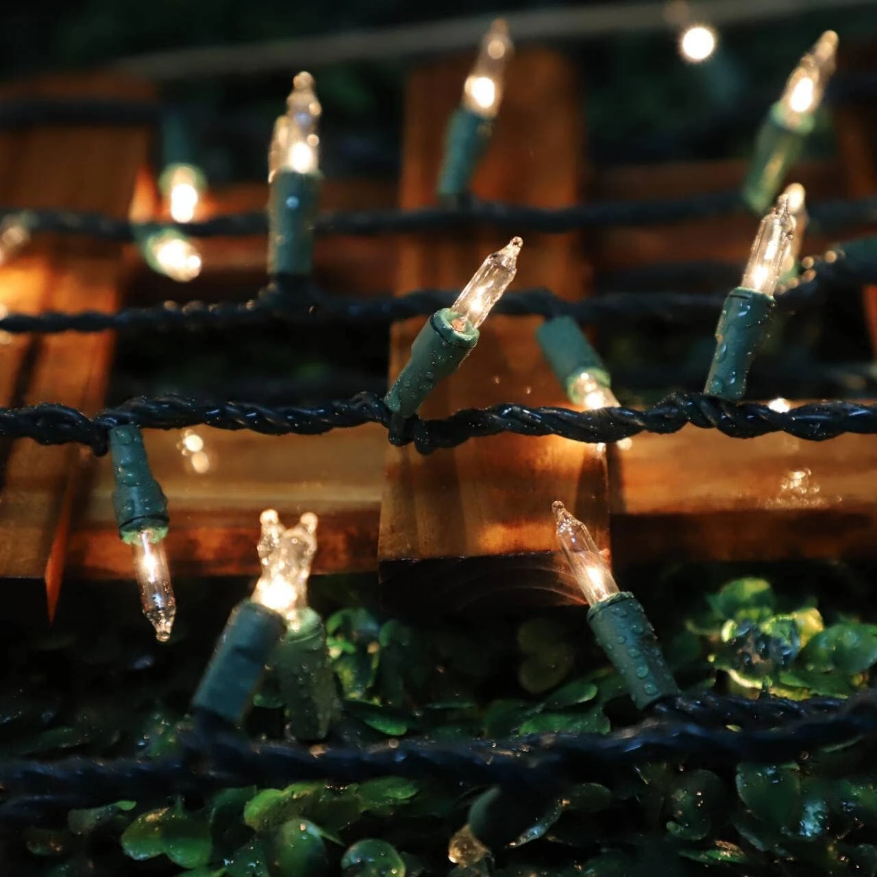 - Green Wire Decorative Lights: Decorate with 100 Clear incandescent mini lights with green wire will give a soft festive feel to your Christmas. Each bulb space 2.5in, 2.5V and 0.425W per bulbs, built-in 3A fuse for safe use. Extra bulbs and fuses are included.