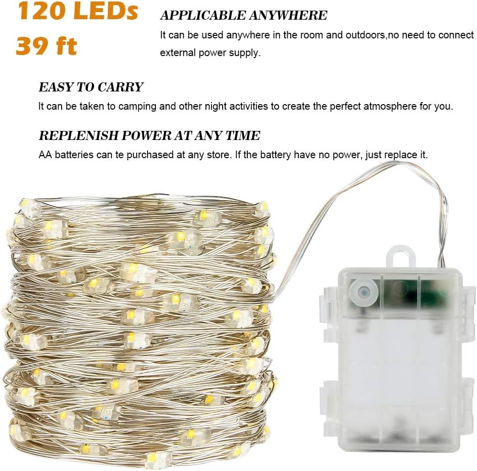 - 【39Ft, 120 Led, 16 Vibrant colors】Compared to other 33 feets, 100 led battery fairy lights on the market, we made it 39 ft with 120 Leds, which is more useful and cost-effective. Use the remote control or press the button on the battery case to switch different colors like warm white, red, green, blue, orange, purple etc to create ideal ambience in special events and occasions.