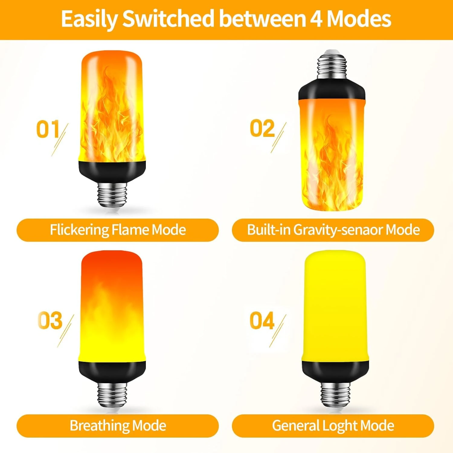 - 4 Modes – The flame light bulbs with 3 Watts and feature a 360-degree beam angle these LED flame light bulb has flame simulation mode, breathing mode, general light mode and gravity sensing mode. The led flame effect light bulb’s effect is very natural with a beautiful glow, like a real burning fire. The mode of the flame light bulbs effect can be changed by turning the power on after each power off.