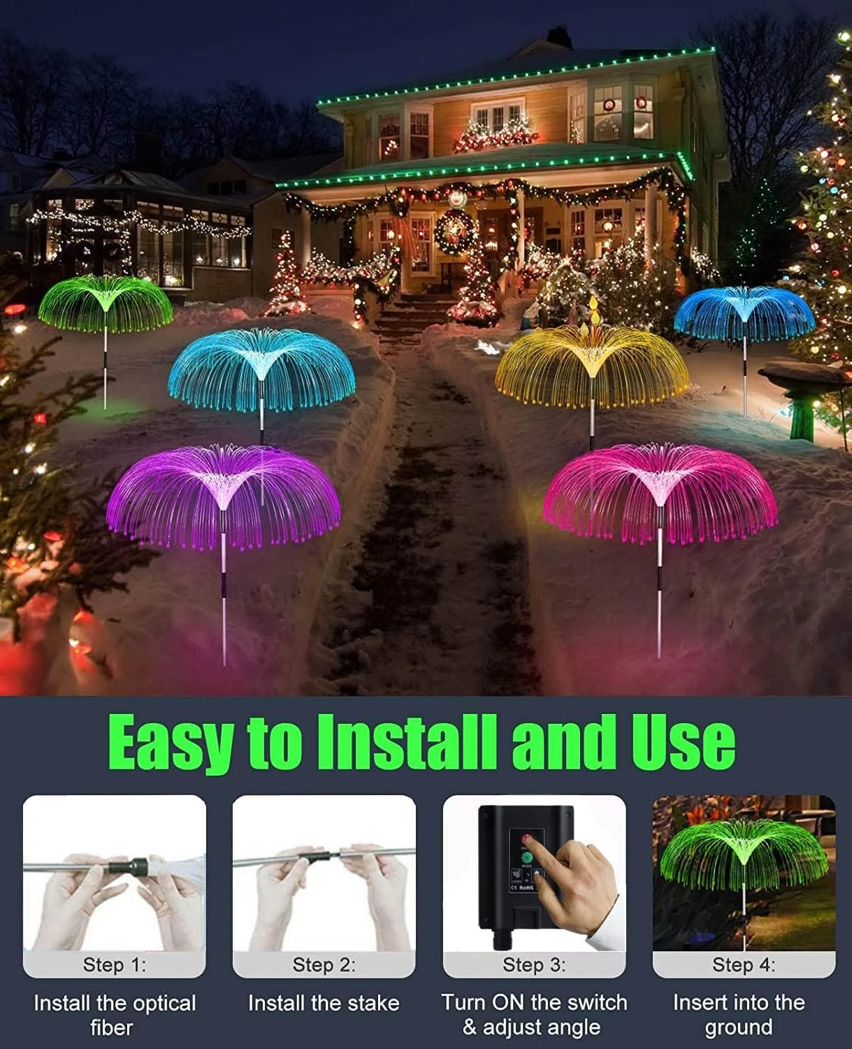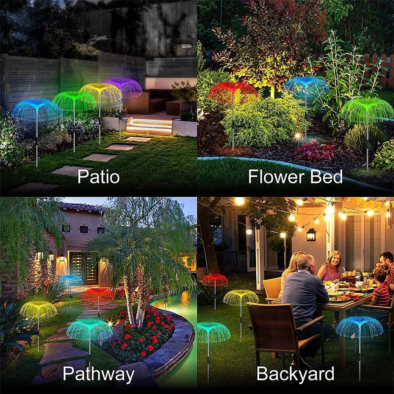 - 【Unique Jellyfish Shape and Durable】The courtyard lamp is made of plastic optical fiber and is made by injection molding process. It is corrosion resistant and has strong light transmission, the overall appearance is like a jellyfish. The solar outdoor lights is particularly eye-catching, and the unique shape design makes your garden beautiful and distinctive. Ideal for the garden, patio, trees, flowers, flowerbed, fence, lawn, pathway, campsite, fountain pond, landscape lamp.