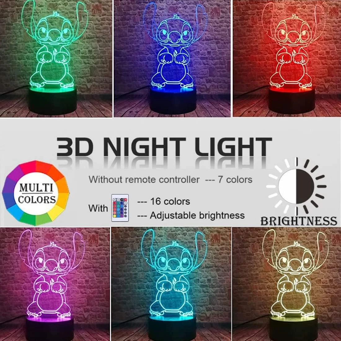 - Touch And Remote Control Mode: Stitch Table Lamp can touch the button on the lamp holder or use the remote control to change the color. You can change the 3d night light in 7 colors by touching the button and the remote control, and you can choose the color according to your mood. When you are lying in bed and do not want to leave, you can use the remote control to turn off the night light, which is very convenient and easy to operate.