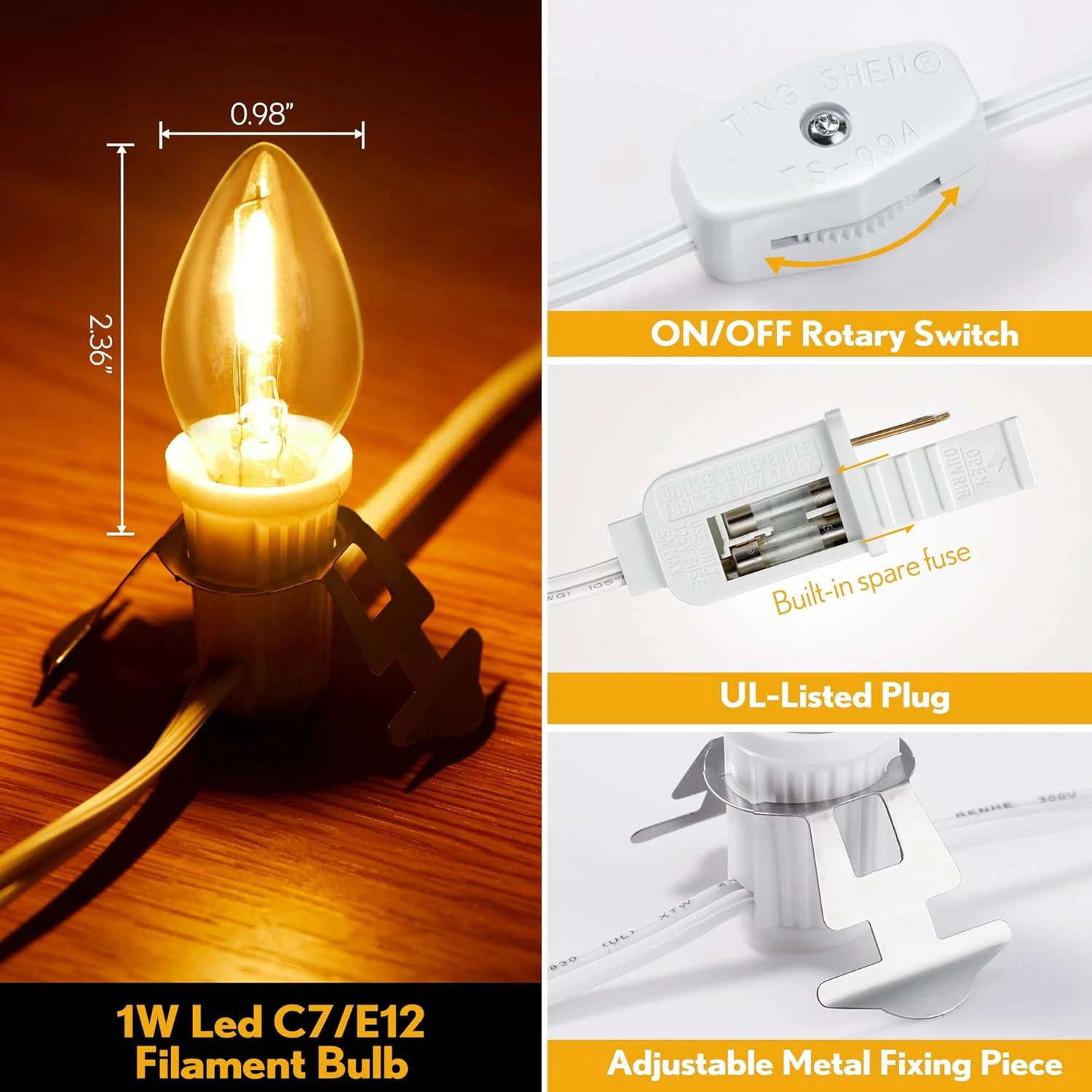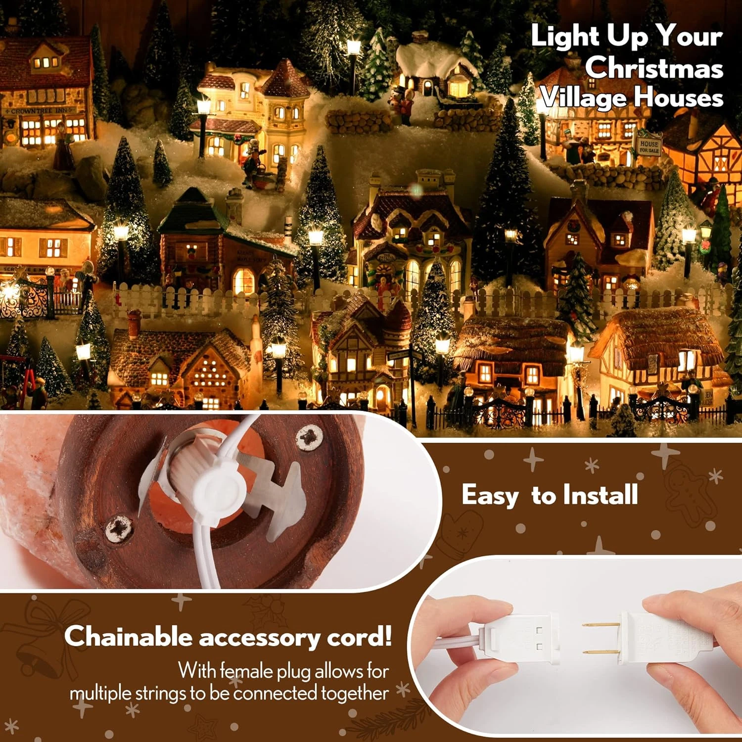 - C7 lamp with spare fuse: differ from other Christmas village lights cord, ours has 2 built-in fuse wires in each plug for each LED bulb light, you can easily push and open the fuse protection strip and remove the spare fuse