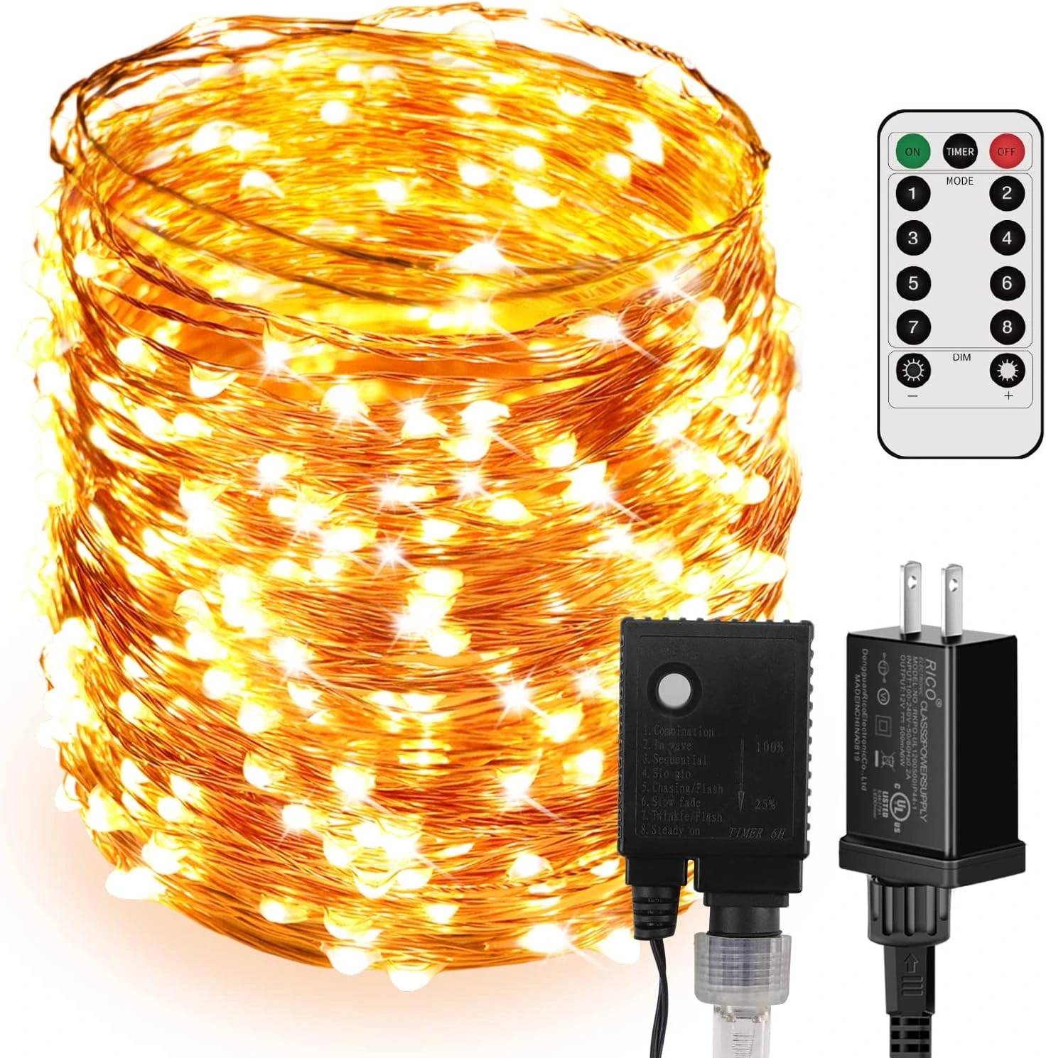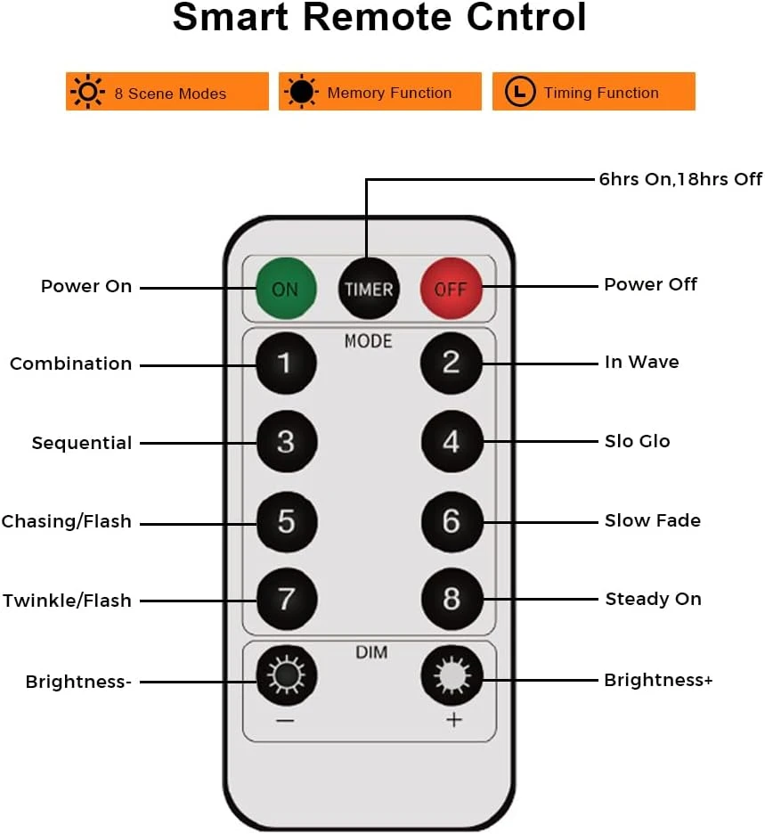 - Tree Lights with 8 Modes: The string light all modes by including 13-key remote control with timing function, light brightness adjustment function and 8 kinds of changing light modes include automatic cycle/wave transformation/flicker transform/alternating light and dark/slow flash transform/change your breath/flash transform/long light mode