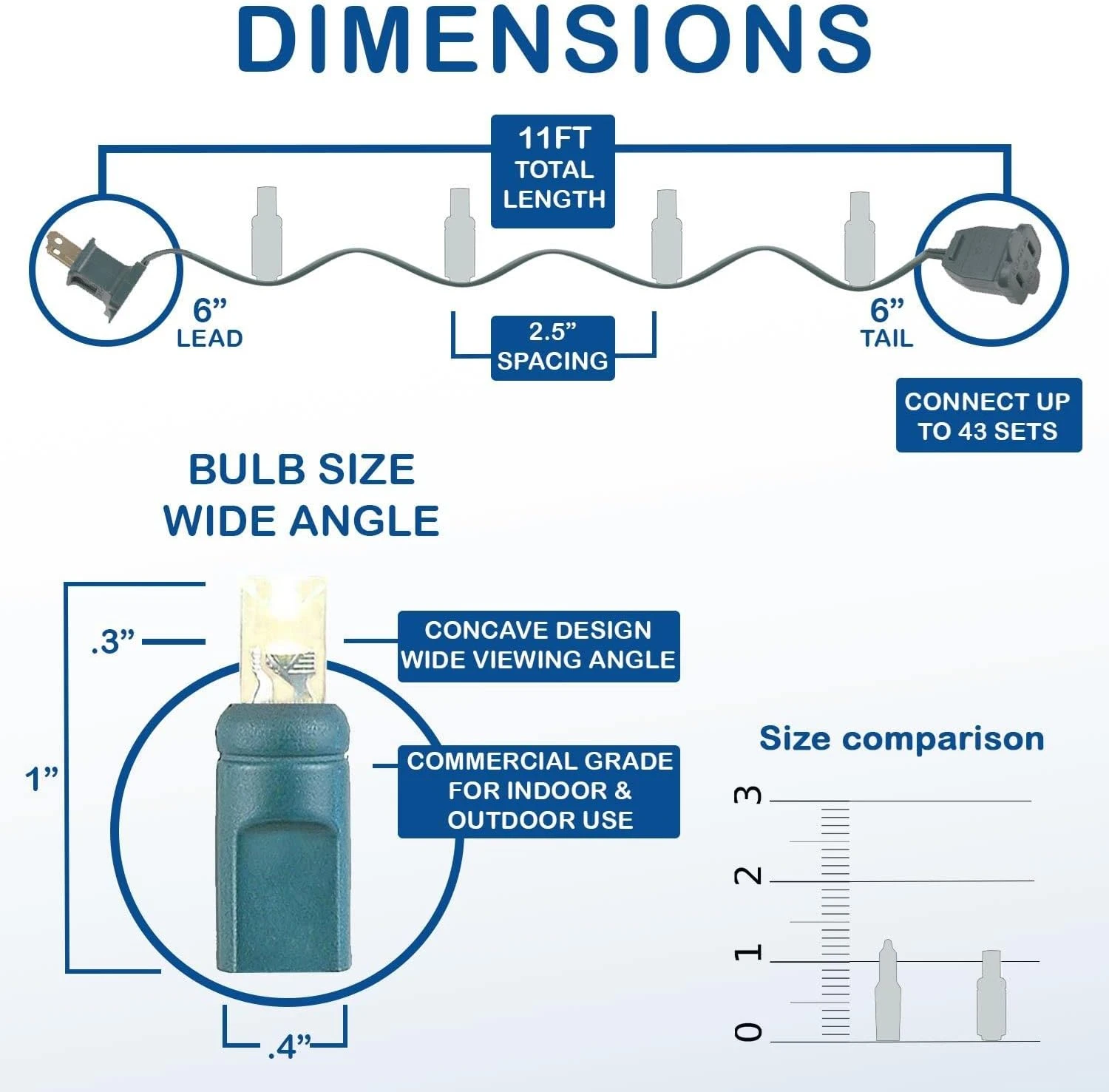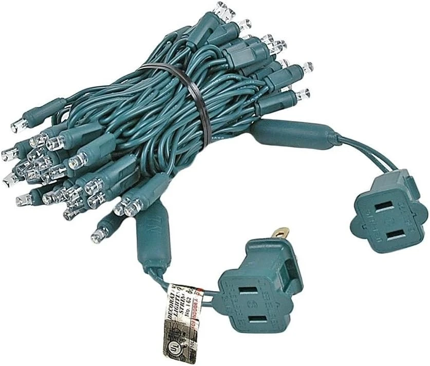 - [SPECIFICATIONS] Set of 50 Warm White (soft white) LED bulbs on 11 feet of green 22-gauge wire. The 5mm bulbs are spaced 2.5 inches apart, and there is a 6-inch lead and 6 inch tail. These sets are connectable end to end with a maximum of 43 strings connected on a single plug (473 feet total). 4.8 Watts (0.04 Amps) Per Set. Stackable Fused Plug With 2 Extra 3 Amp Fuses